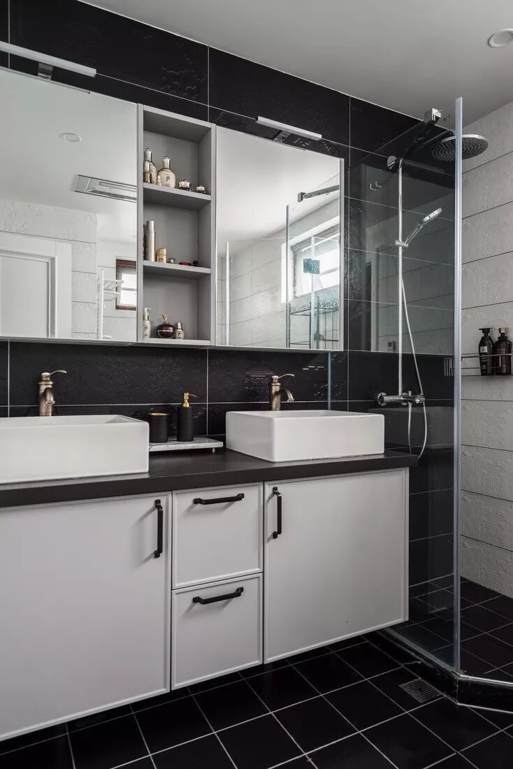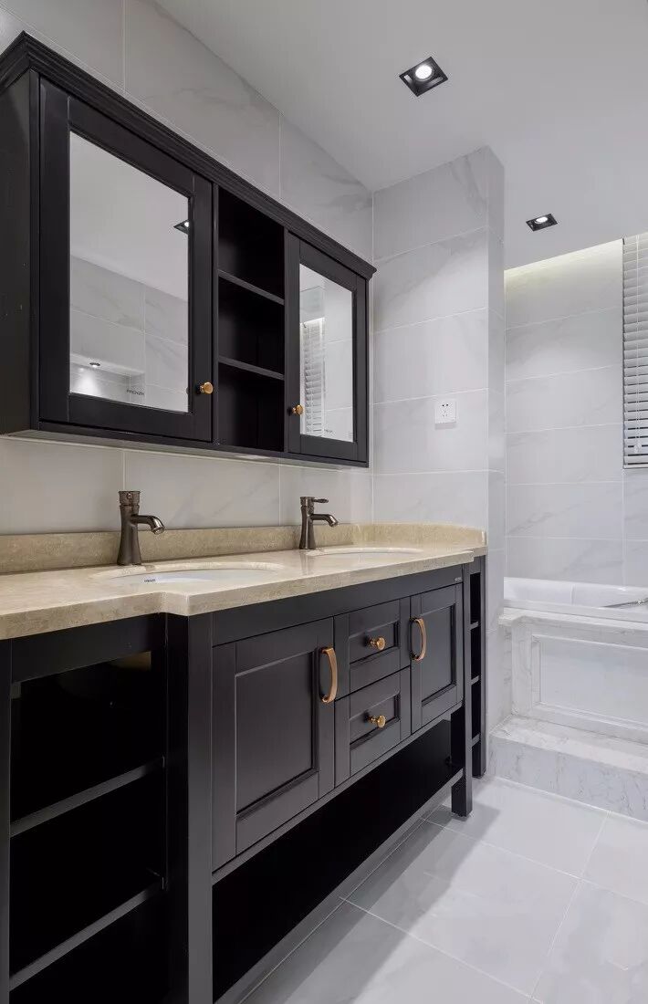 两侧镜柜+中间留空的设计,只适合一些比较宽大的双人洗手盆,中间放置洗漱用品,两侧分别是梳妆镜。