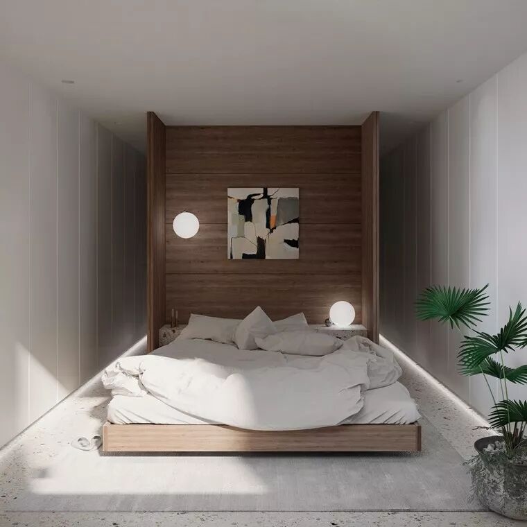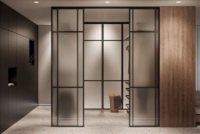 长型的私人空间以雾面玻璃铁件作为更衣室的区域,不仅能满足屋主使用,更具有遮蔽后方床铺的效果;磨石子的质地和木板材的搭配十分讨喜,摆上盆景与轻巧的饰品,简而纯粹正是卧室空间最适切的面貌。
