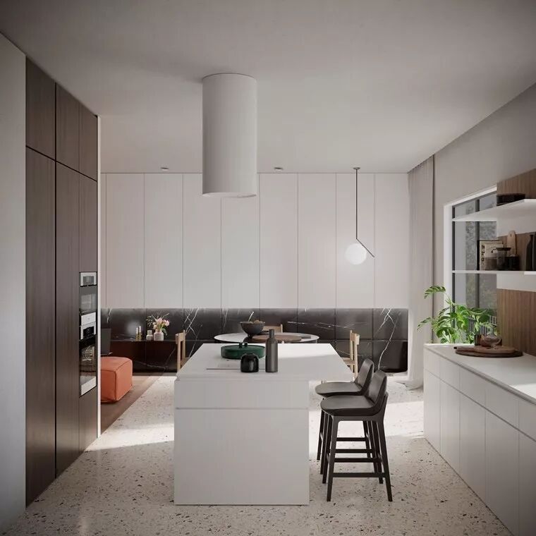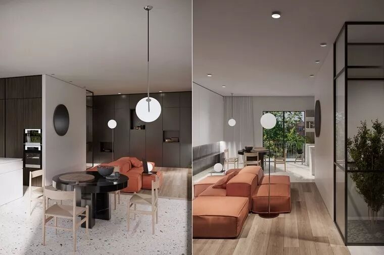 来到客厅,建筑师以木地板拼贴和玄关、餐厨空间加以区隔,搭配颜色鲜明的橘色沙发床组,并以圆形的元素加以妆点,包含沙发背墙的黑玻镜、用来辅助照明的灯座与吊灯,让人感受到百分之百欢愉的调性。邻近的餐厨区域则包含餐厅跟厨房,地板采用与浴室相同的磨石子质地,提供细腻优雅的基础;光线从落地拉门自然而然进入室内,与木纹质感的深浅搭配,让白色柜体为主体的厨房拥有更温和的个性,想必在这里烹饪定是十分惬意的事情。