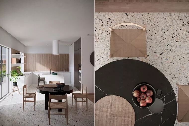 从日本统治时期开始,台湾开始引进磨石子,在地板或墙面将其打底整平后,填入石材再进行打磨作业,与现在常用的磁砖相比,工期较长、工程也较繁复,但所呈现出来的质感是非常迷人的。这项技术渐渐失传,但随着时代变迁,国内外厂商也开始运用数位喷墨的技术,试图将磨石子动人的细致表面加以呈现,更被设计师运用在居家、商空设计案中,比如说这个位于克里米亚半岛费奥多西亚的作品正是如此,藉由建筑师 Alexander Velgan 之手,以天然石材与磨石子的质地,打造清新舒适的阳光之宅。