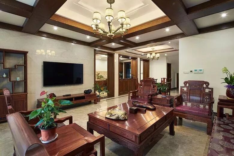 在一些现代中式风格里,把石材与木雕边框搭配起来的电视墙,也是很优雅高档的,尤其是像34图那样诗意质感的大理石,效果相当的儒雅高档!