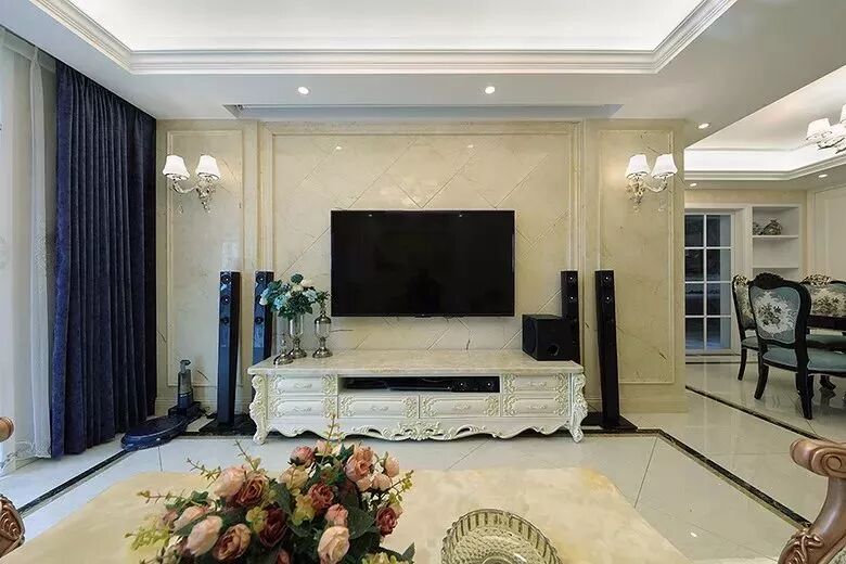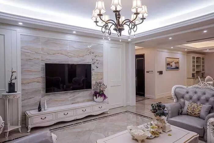 一些欧式风格里面,以石材作为电视墙的话,也是比较多见的搭配,这样搭配的空间比较显得现代简洁。