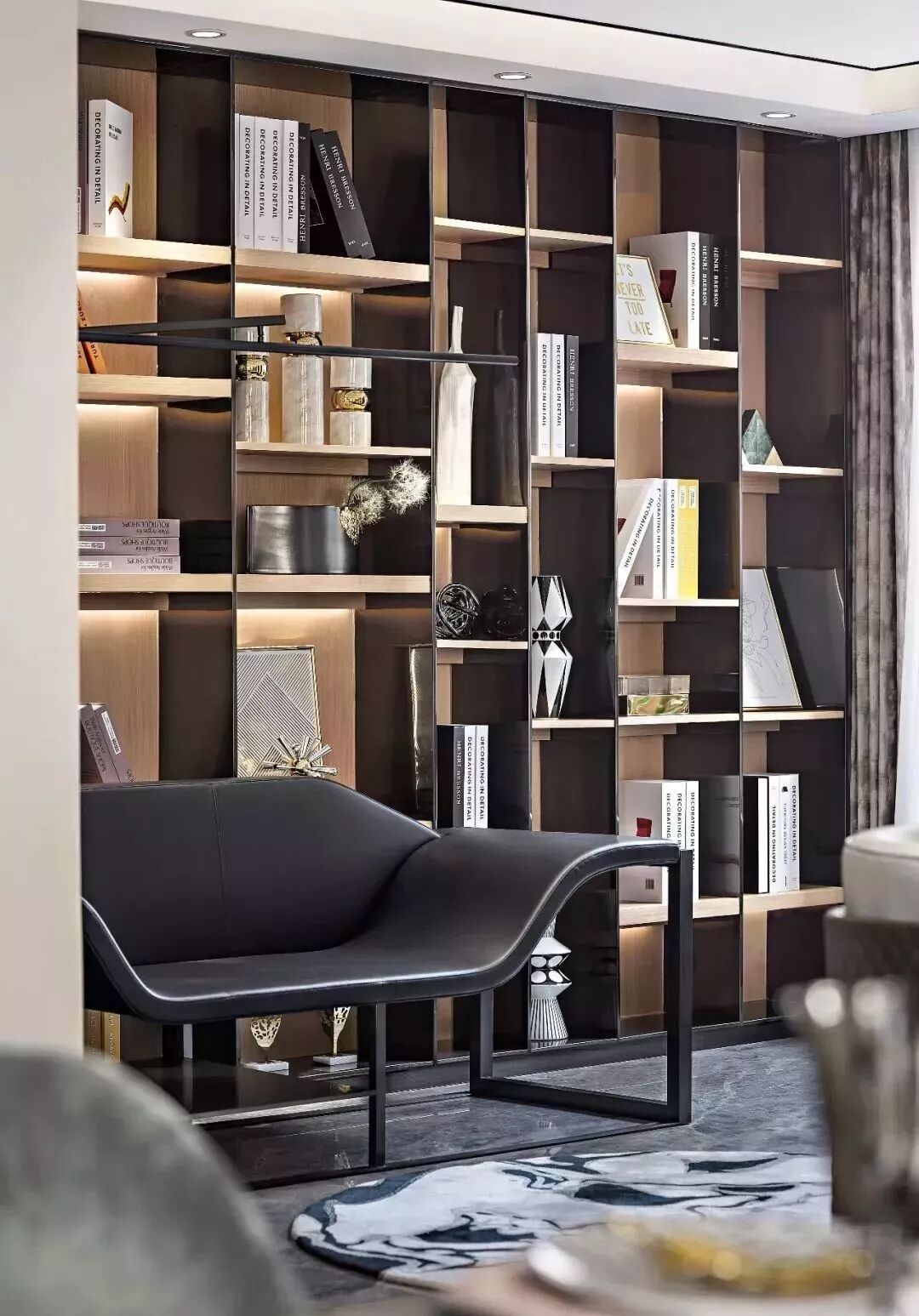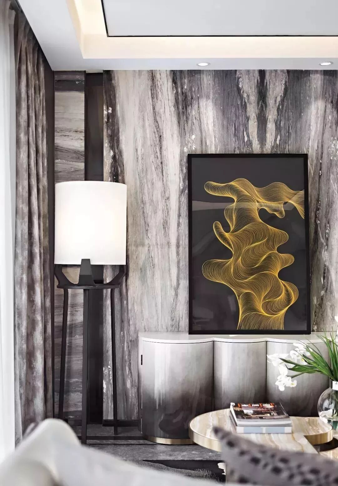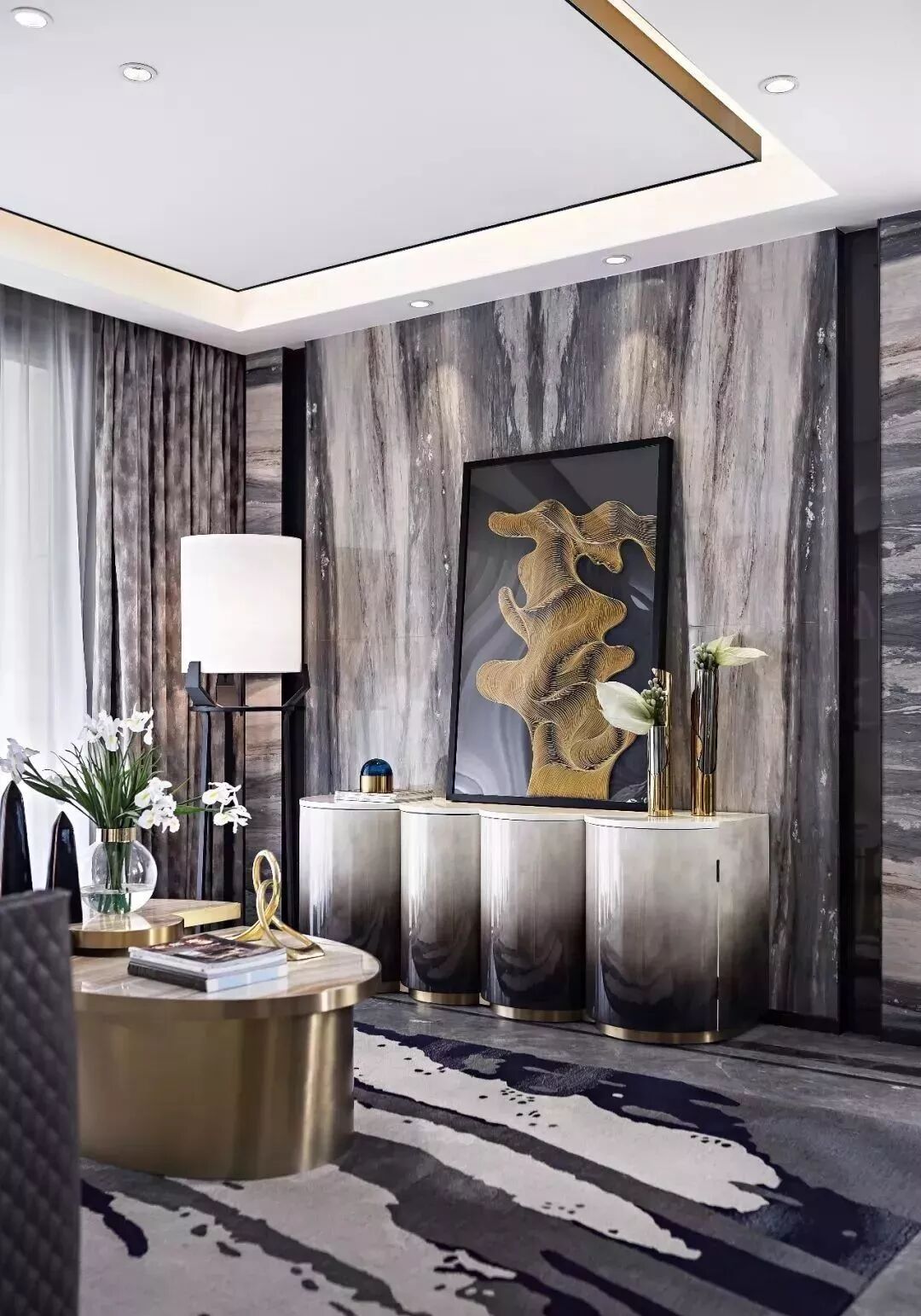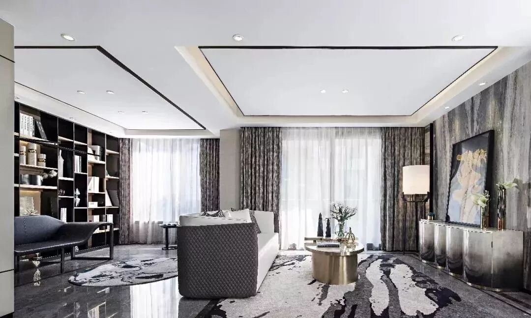 “灵动”“悠扬”是整体空间带给人的第一印象。多功能室与客厅的顶面、地面、墙面均保持材料与手法的统一。深色的镀钛金属运用在整体浅色调的空间中,勾勒出了简洁的体块与精致边线,地毯水墨的氤氲之气与带有花灰色纹理的大理石之间低调地呼应着,同时也体现了硬装和软装之间的契合无间,营造出与自然无比亲和的审美境界。