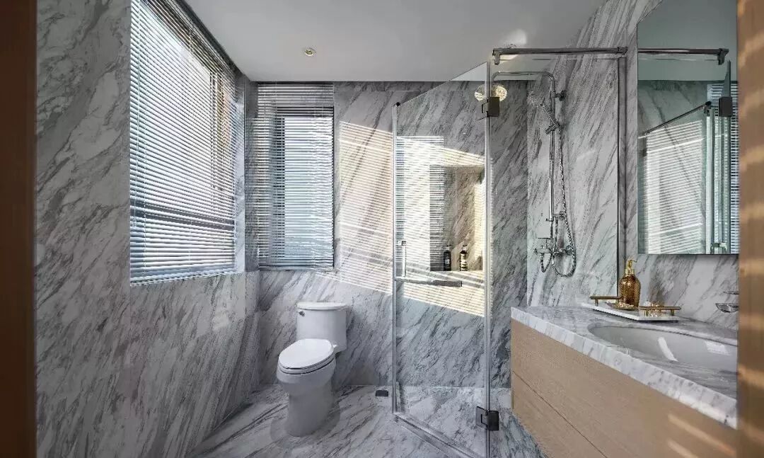 卫浴空间的色彩与线条都十分简洁利落,正适合将琐碎的日常生活容纳其中;白色石材的自然纹路与金属镜框的优雅弧度则使得简约的优雅感,随着洒入的阳光,在空间中蔓延。