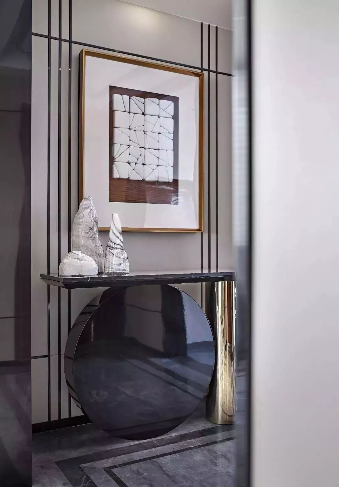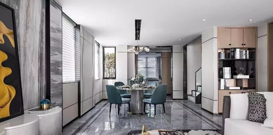 从入户门进来,几何的拼贴画加上精心打磨且带有 “水墨纹路”的石山,再配上形状别致的台面,整个玄关既端庄,又彰显着文艺典雅的气质,也提起观者浓厚的审美期待。