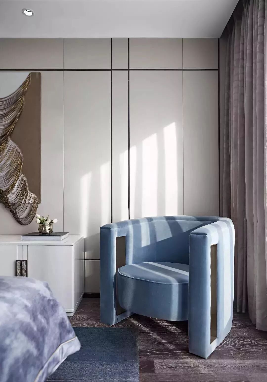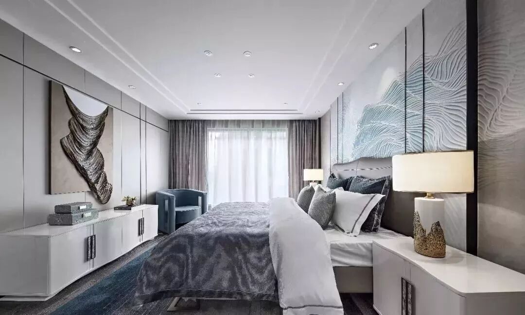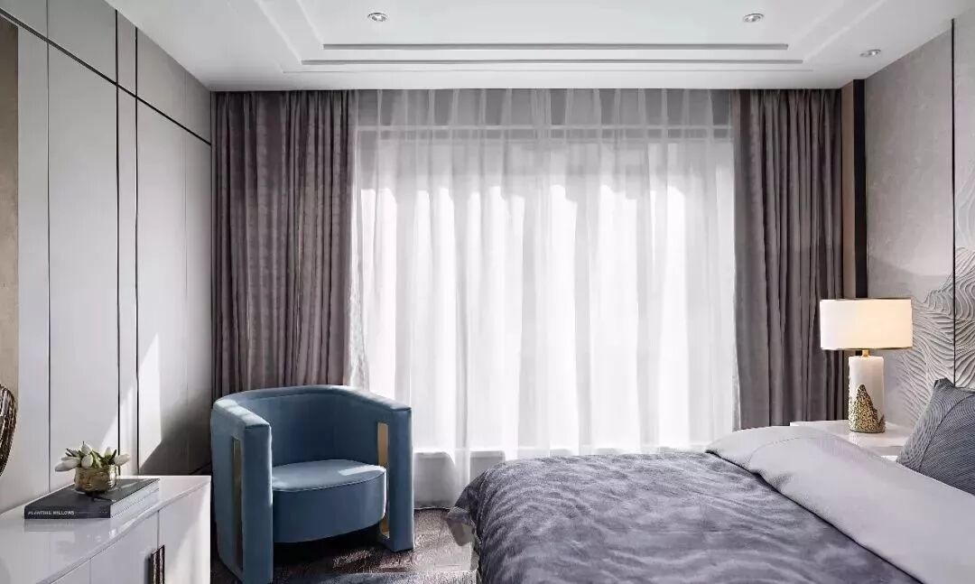 二层的主卧室同样是以米灰色为基调的空间,在这里呈现的是更为活泼明快的气质,笔挺的金属线条分割空间墙面,顶面“递进式”的跌级、优雅线条的背景,成为空间限定的元素。