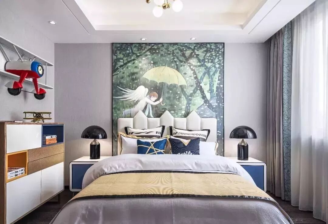 男孩房的床背景是一幅别致的卡通画,其与床品、床头柜及摆件三者关系竖向递增,形成高度的中心对称。背景画中”举伞的天使”,在日光的晕染下更加生动。