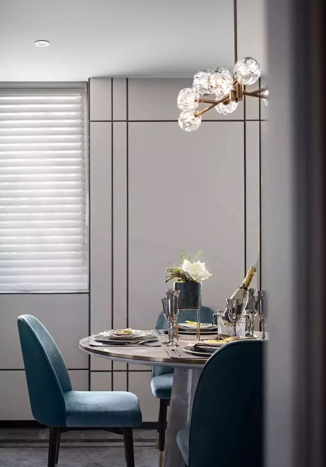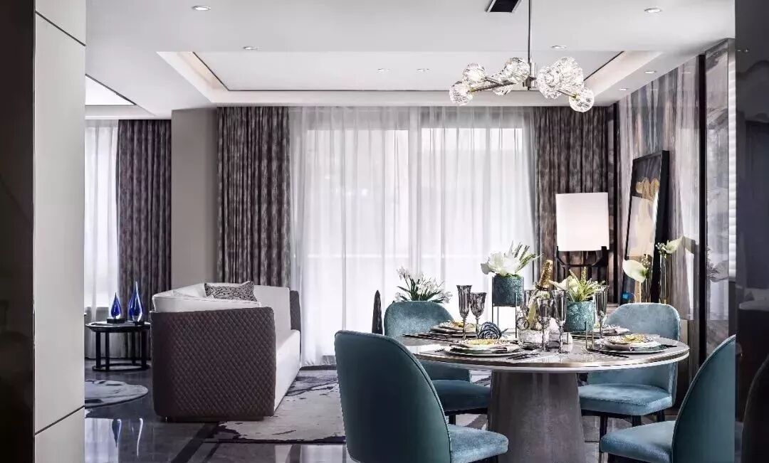 餐厅反差较大的色彩是整个大空间的美好衍生,在米白色的大基调下,宝石绿的餐椅承袭“优雅”“时尚”品质,加上高级定制的花艺、精致的餐具雕塑与艺术品,共同演绎了精睿阶层的宴请礼度。