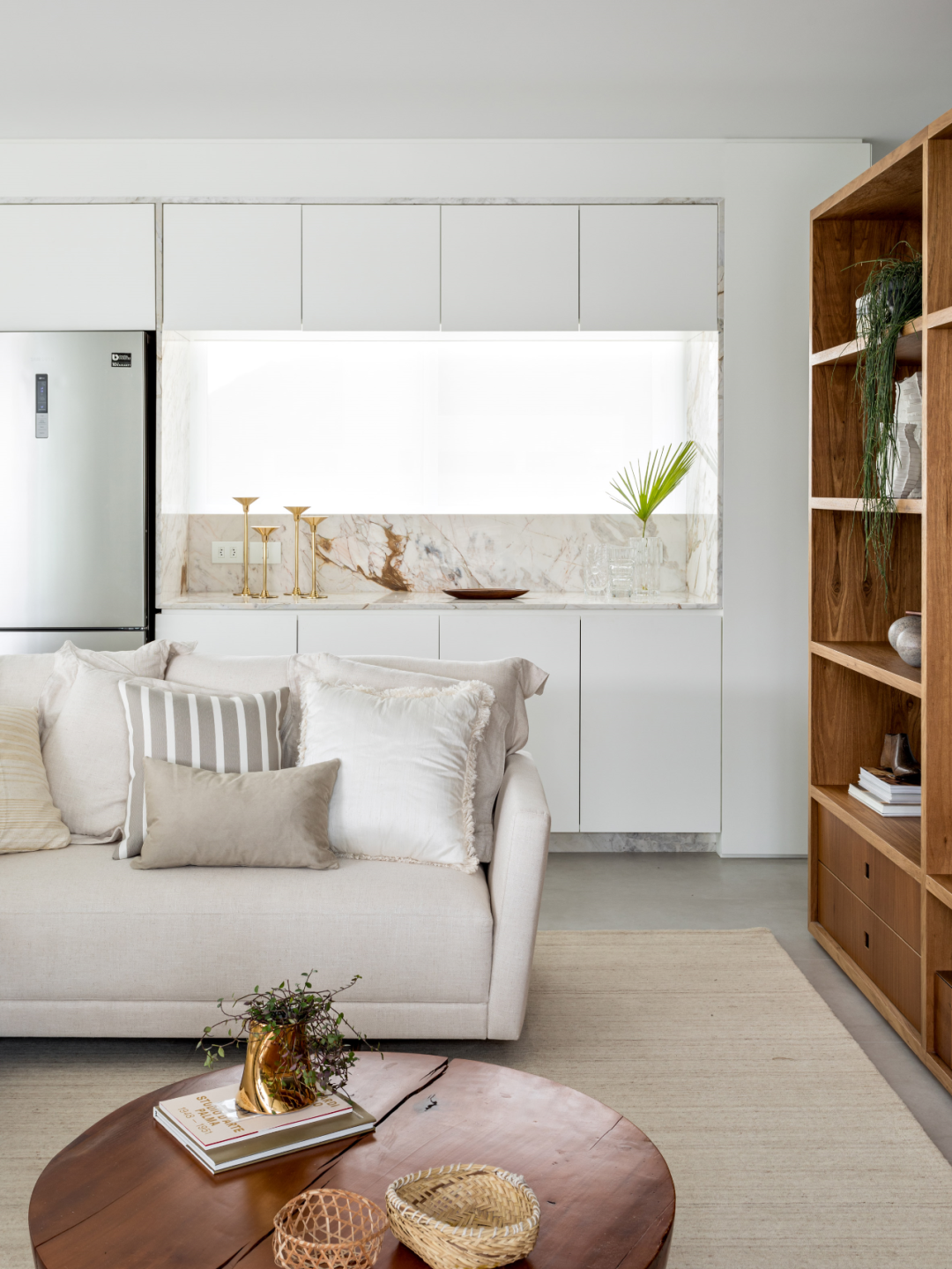 158㎡ 的度假公寓,整个公寓都以白色天然石材提升空间质感,同时运用原始自然的木质,阐述专属屋主的生活感。
