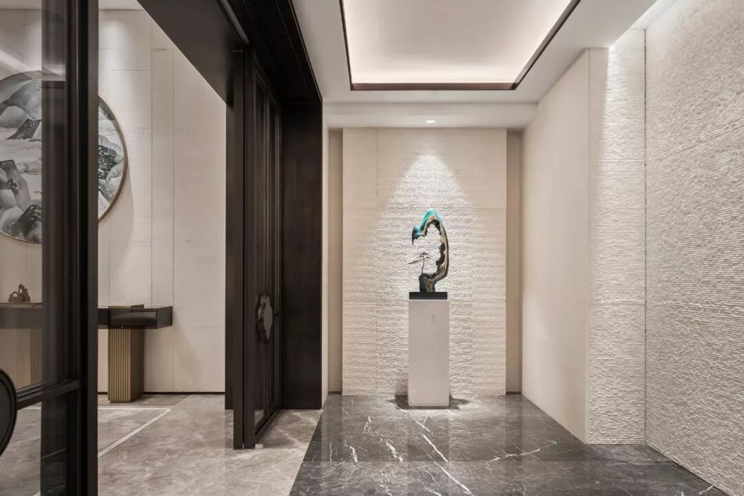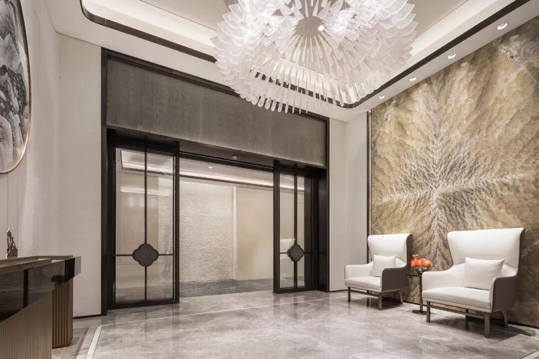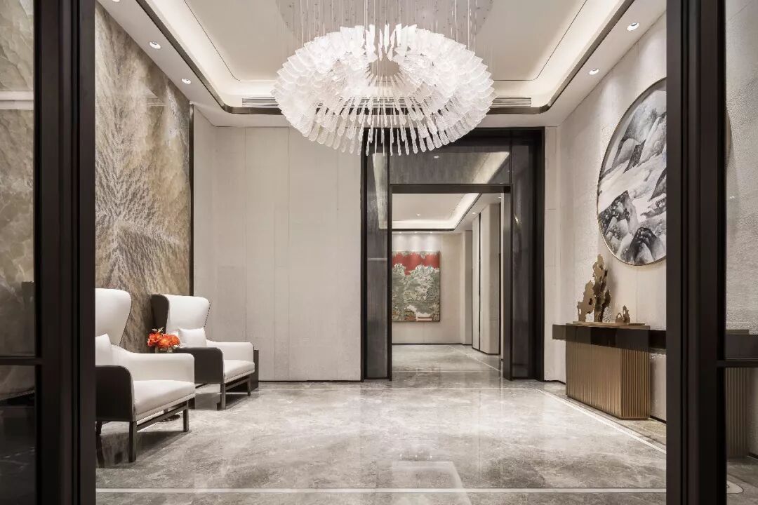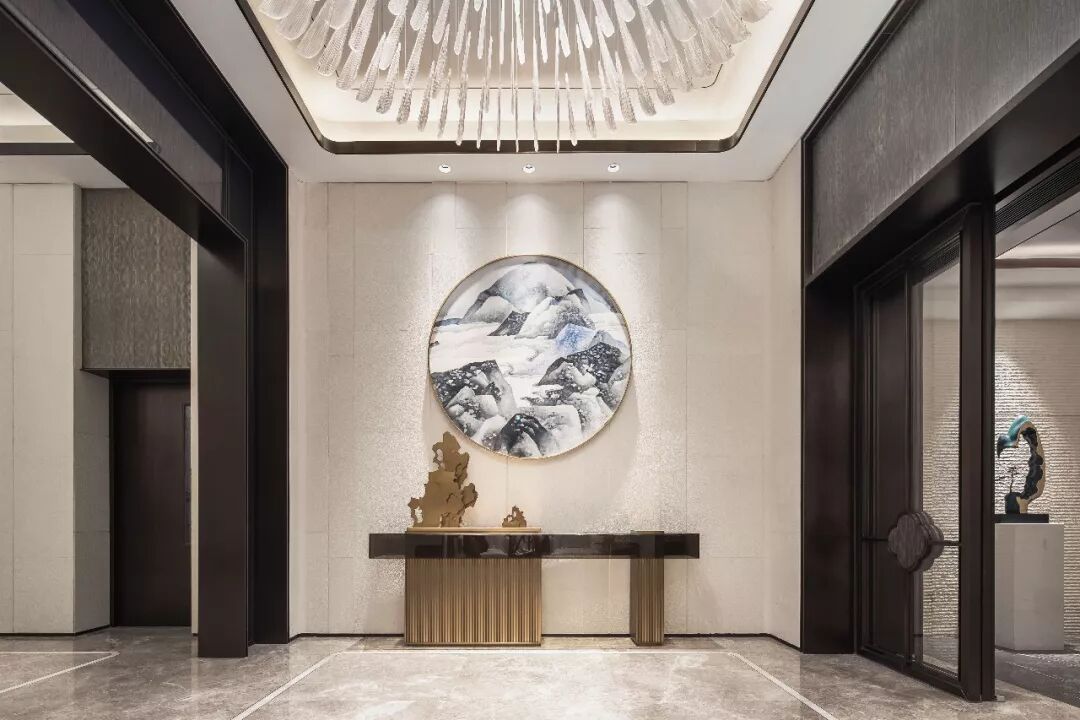 国人崇玉,所谓“玉不琢,不成器。”玉器的制作要经过刻、碾、琢、磨、钻等多道工序,就如同我们对待居住空间一样,经过了不断的否定,推敲到确定。因此该项目的公共空间的设计灵感来自于“玉”,主要从玉的品质及器型的处理上入手并进行延伸,为空间提取了玉的弧线及它的温润与高贵。