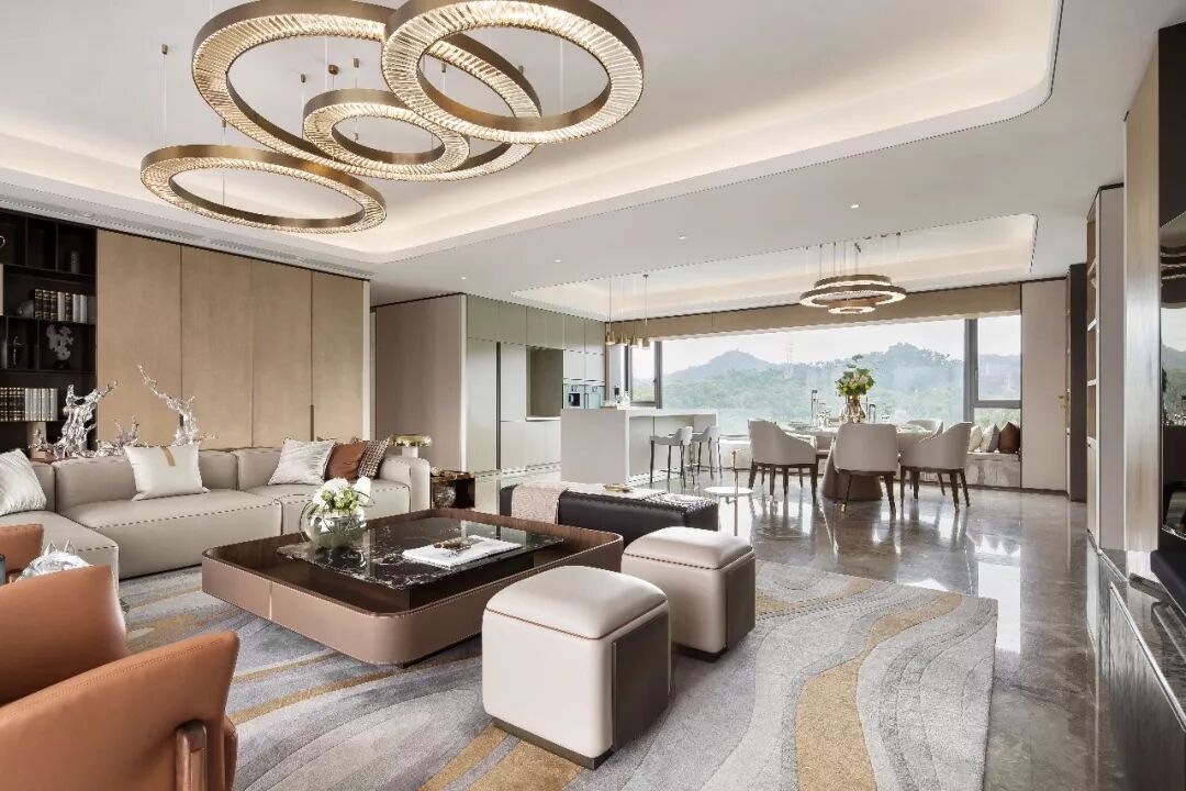 采用现代的设计弧线的处理手法,繁衍生出一个具备文化性,象征性, 装饰性的空间。空间中的艺术表达手法,除了在家居材料的选择上用高品质工艺,还用当代艺术品烘托氛围。这不是一味的简单植入,而是用以西方色彩重新构建中国的青山绿水的挂画去诠释传统的画面,从而有了一种深度意境的延伸。