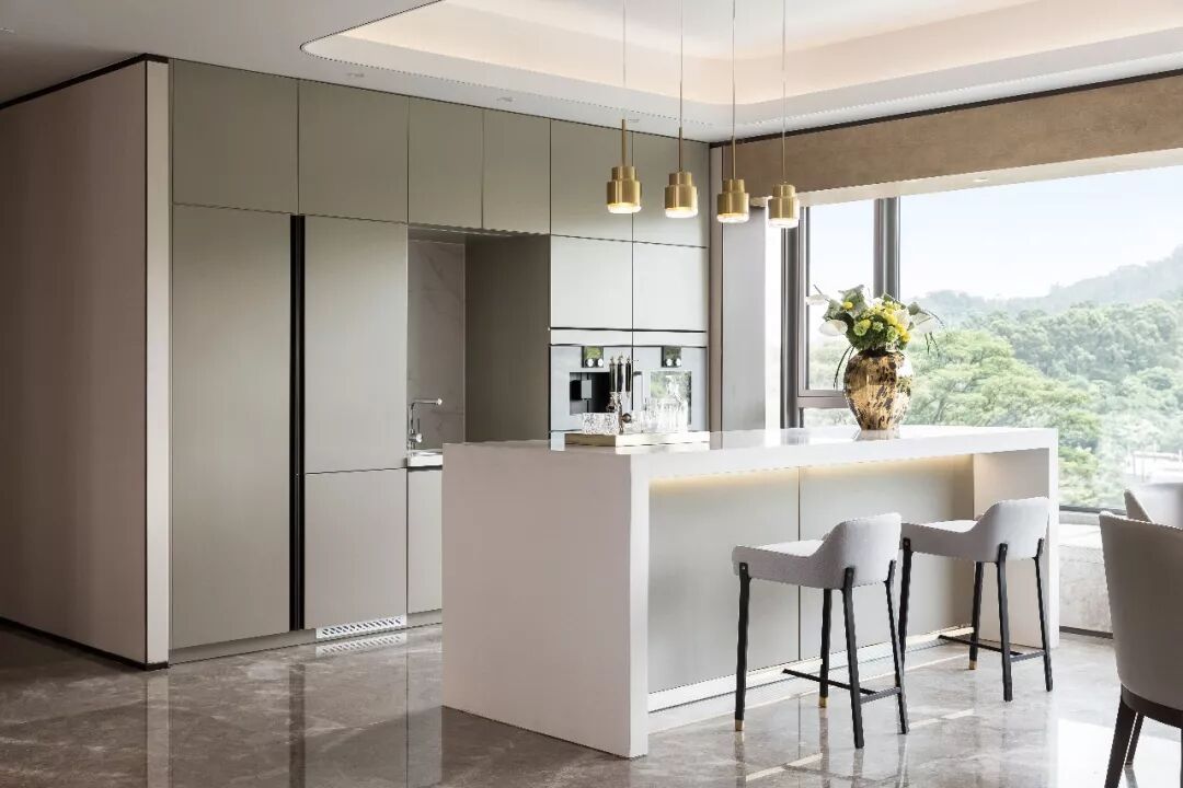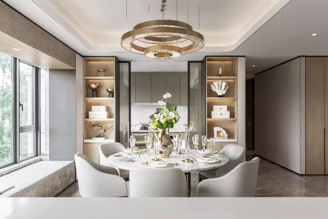 餐厅居于中式厨房与西厨岛台中央,两侧打造内嵌式置物区,客餐厅作为中心,中轴动线串联各功能区,主次关系配合得当。