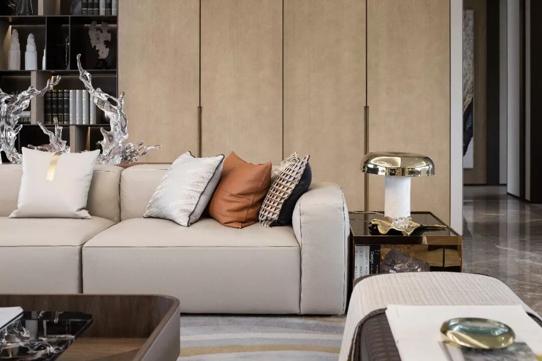 客厅中没有过于抢眼的造型,亦没有浓墨重彩的渲染,而是以最经典的现代设计笔触,令金属、皮革、石材等所有元素协调相处,并选用带有高级感的中性色,来演绎一种“低调的奢华”。被称之为“时光发酵机”,并且精致、复古、明亮而富有光泽的金属黄铜,被恰到好处地运用到室内空间中,让空间不仅增添了一种低调的高级感,也带来了无限的品质感。