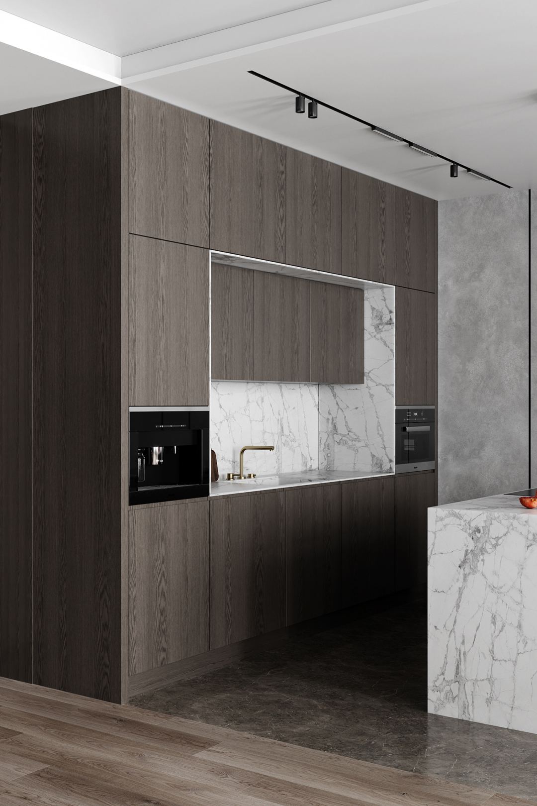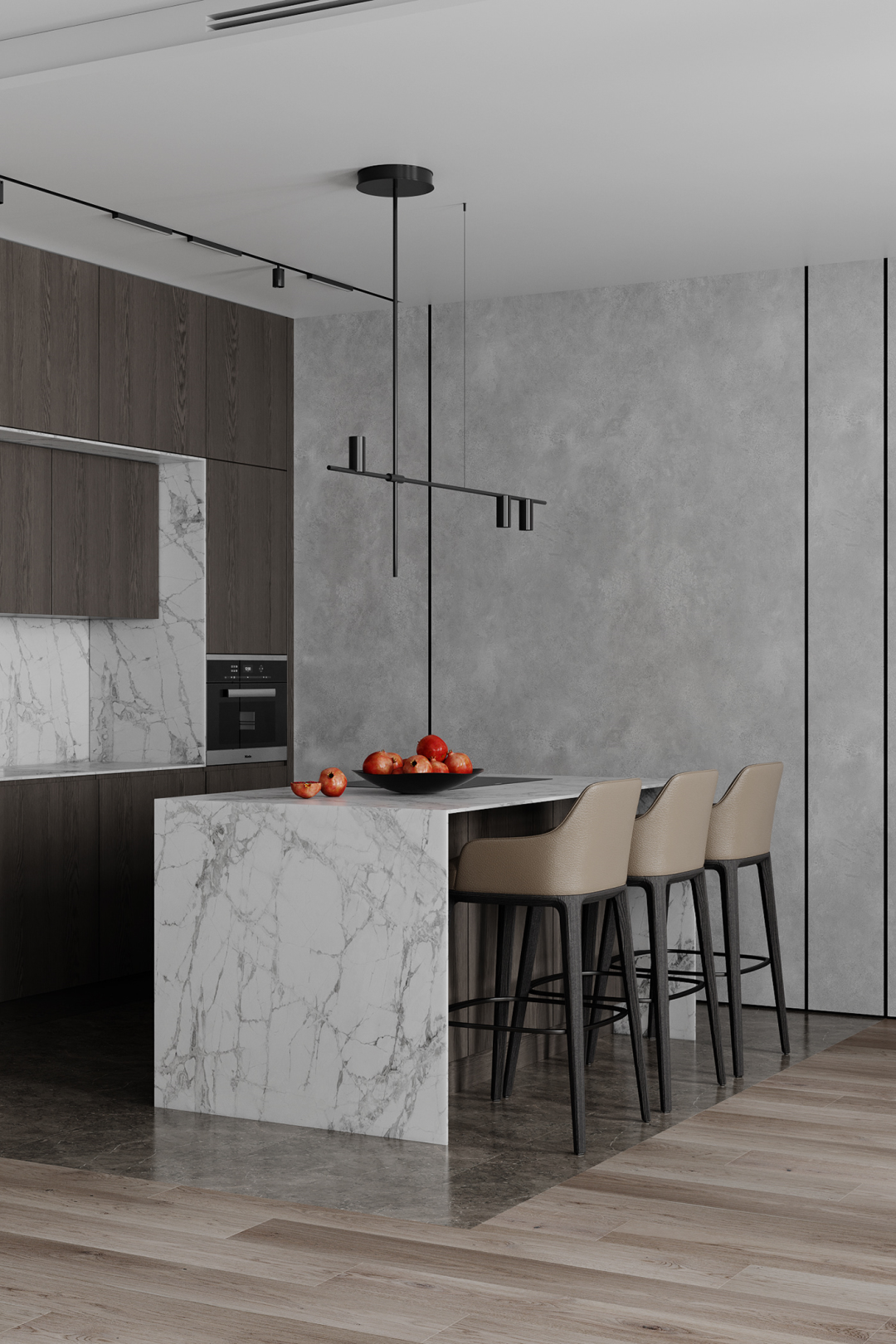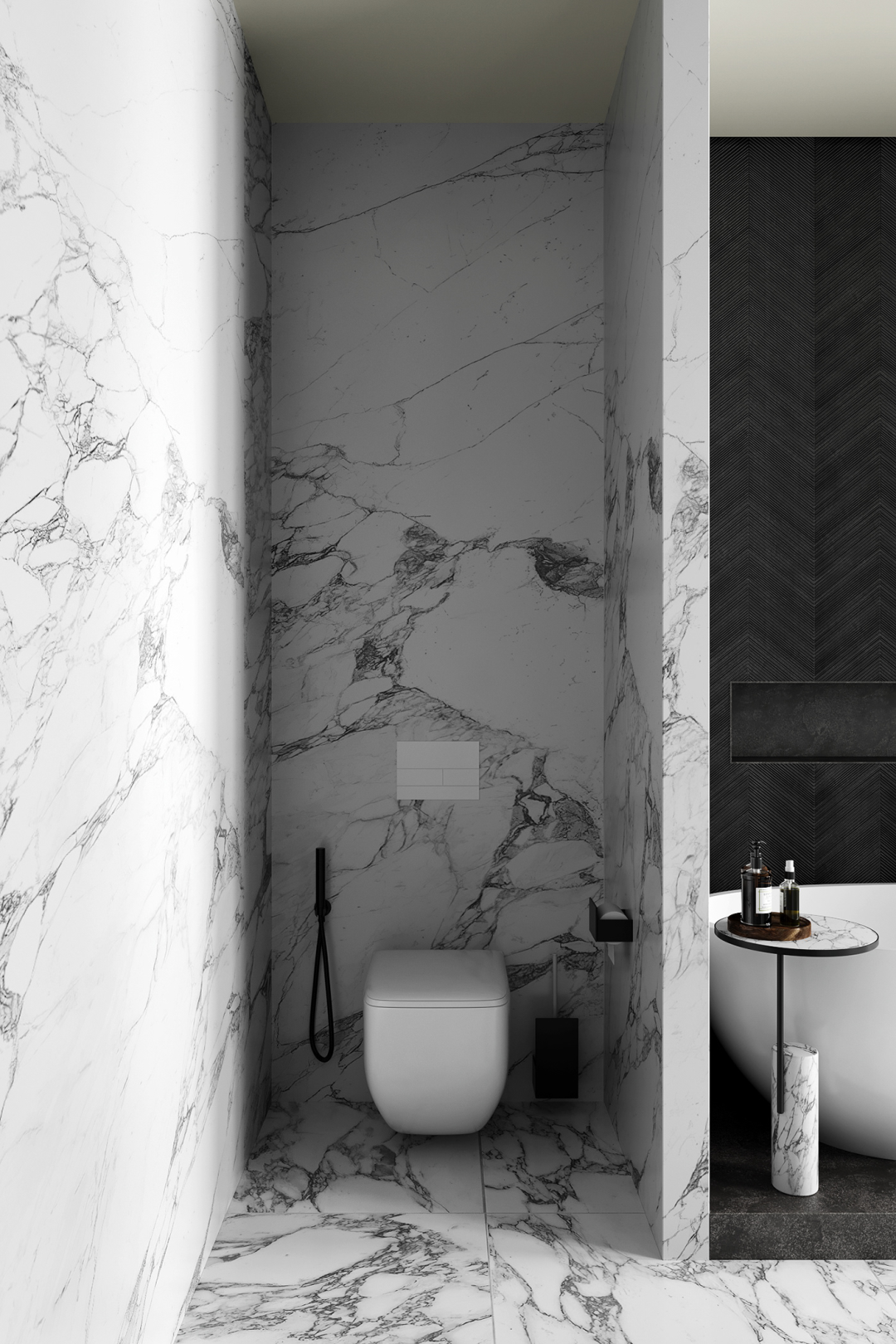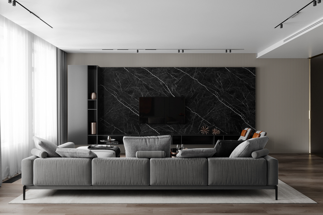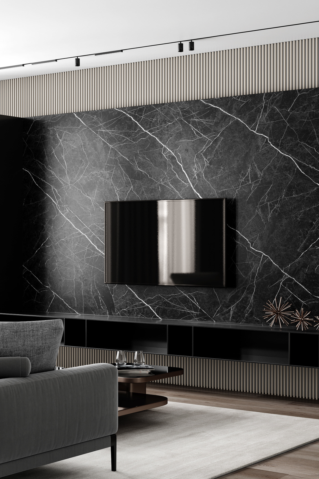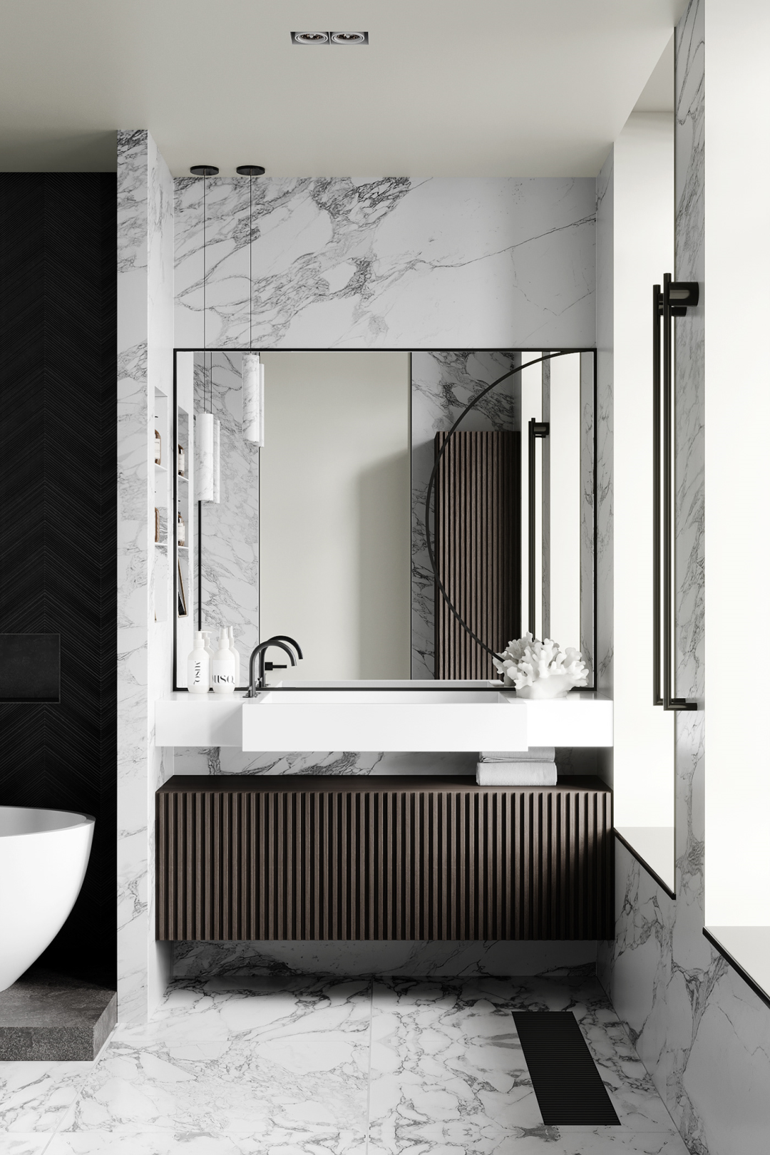 以整块细纹大理石做背景,侧边拼接同色收纳柜