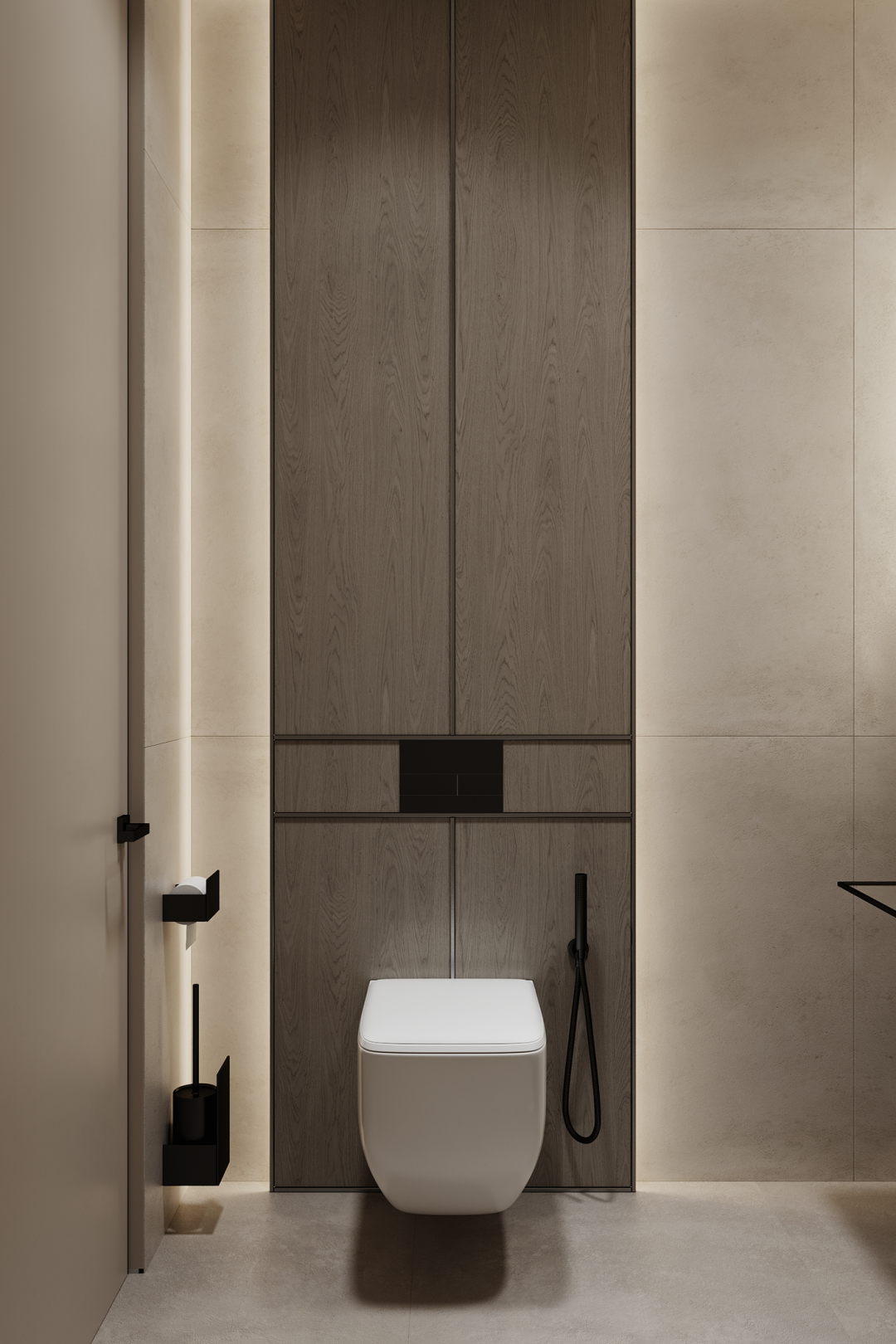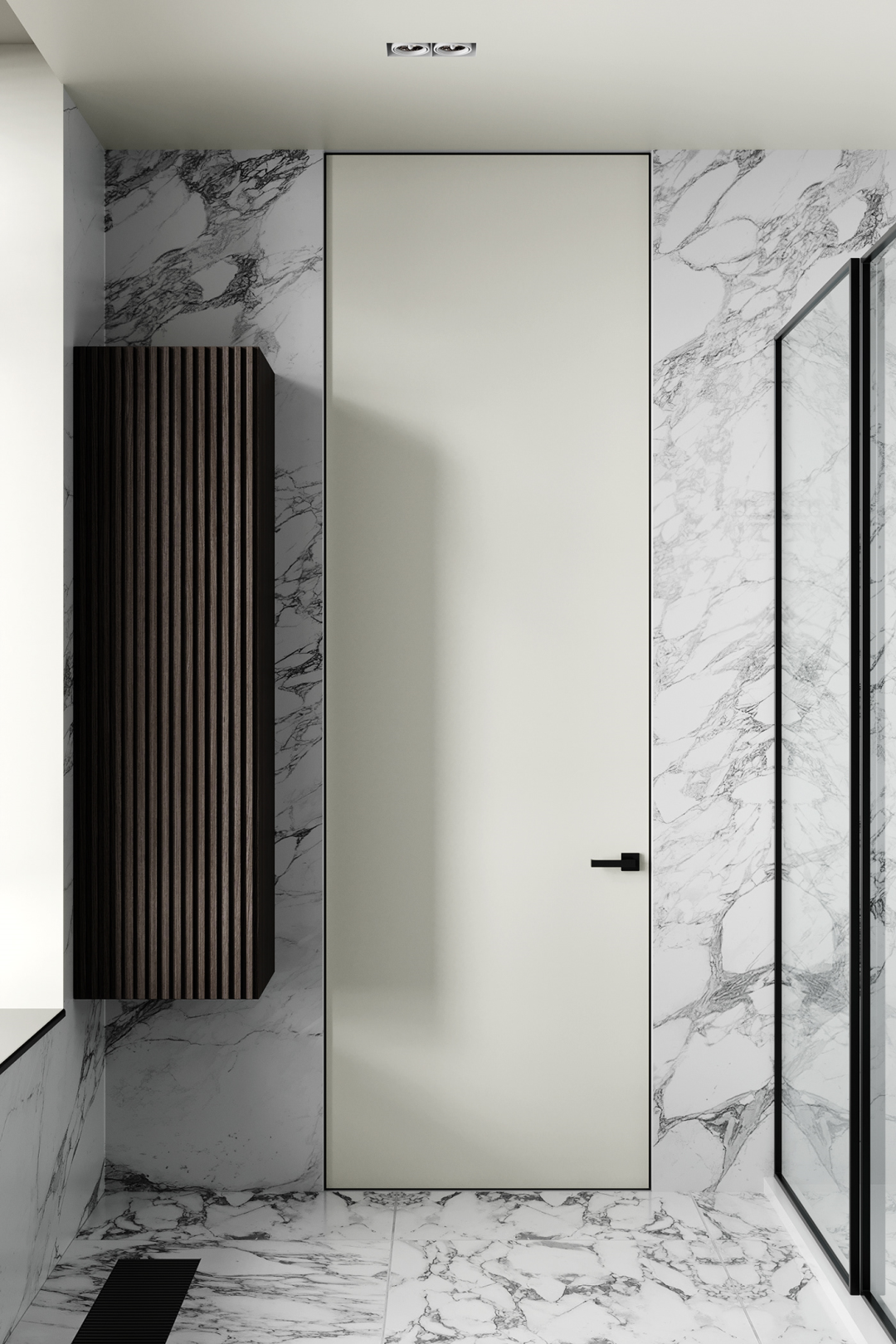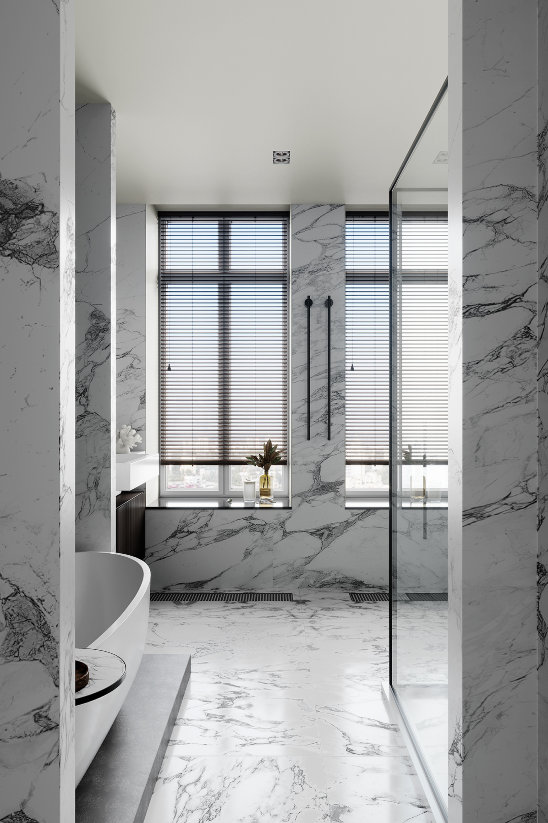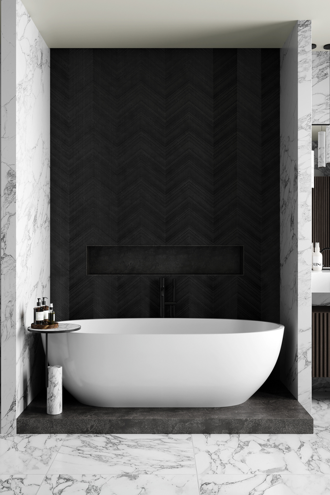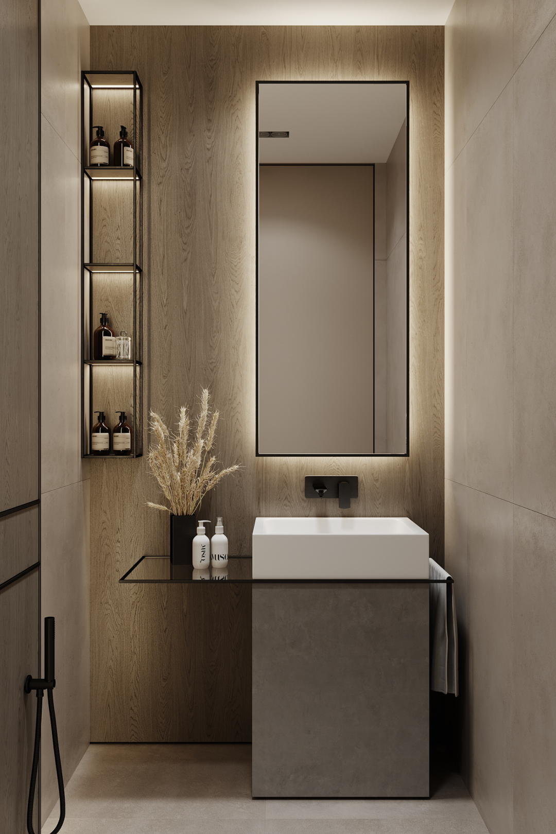 以整块细纹大理石做背景,侧边拼接同色收纳柜