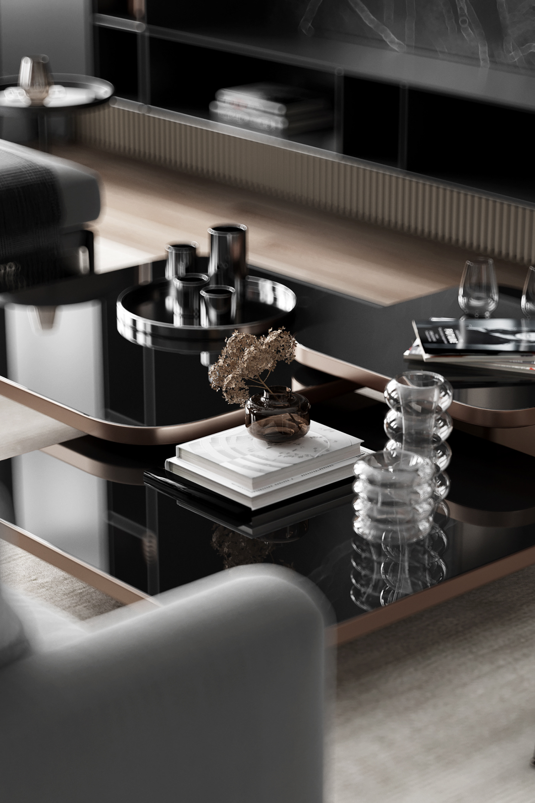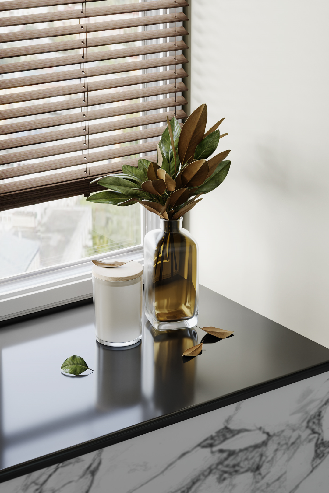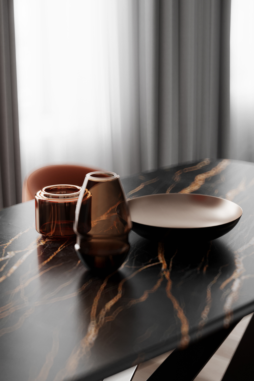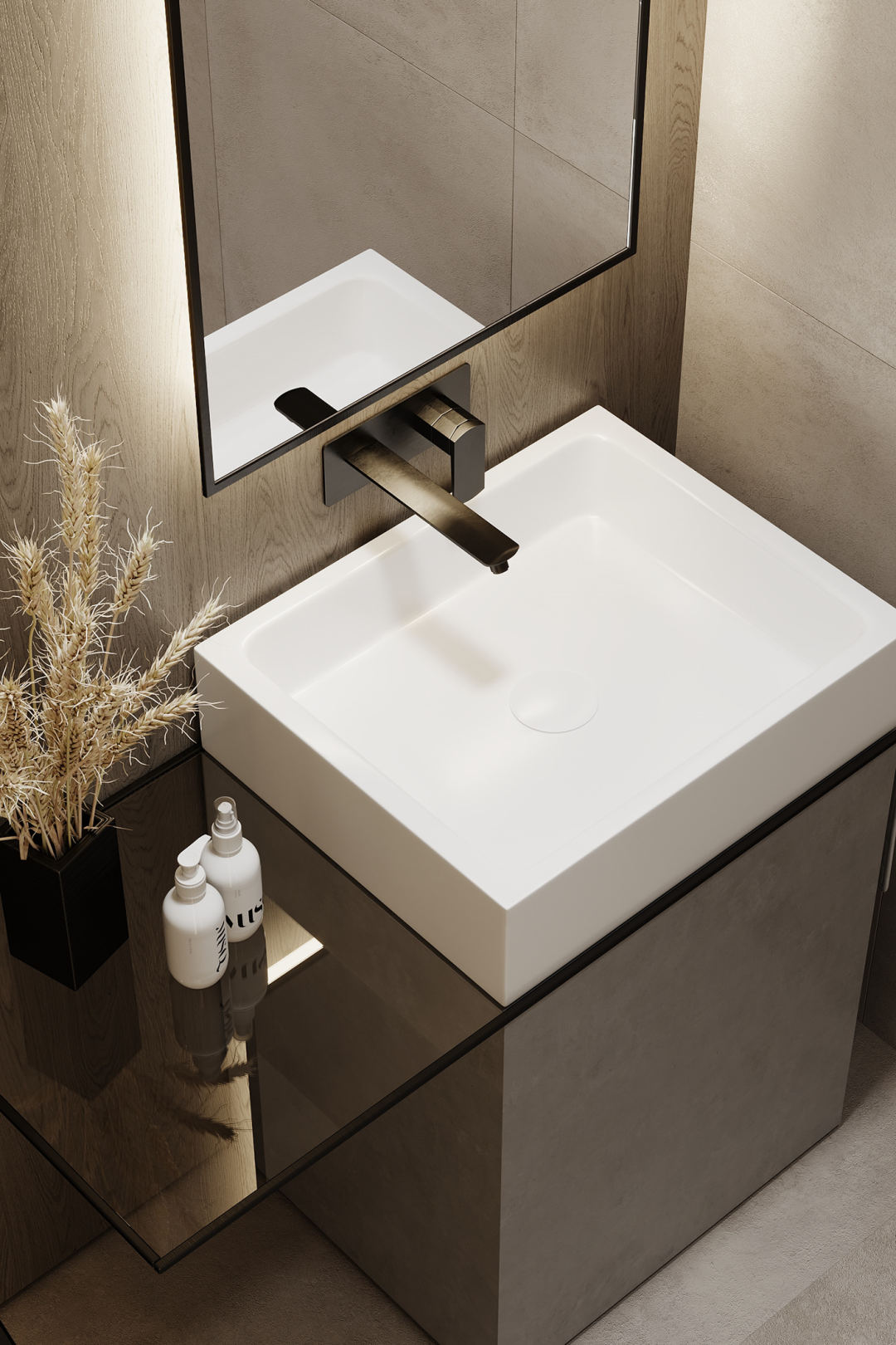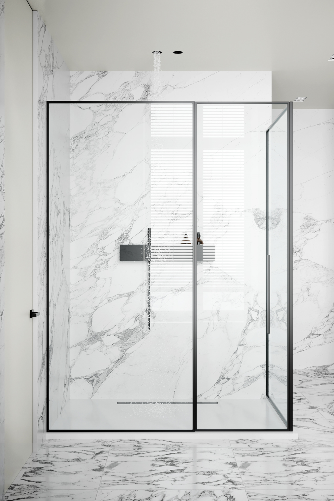 以整块细纹大理石做背景,侧边拼接同色收纳柜