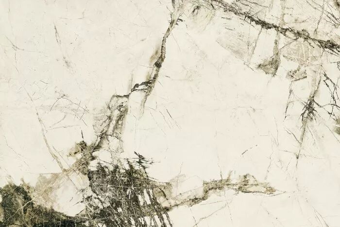 以白色为底,其上深浅浓淡分布不同的灰色,纹理犹如石头千年积沉的肌理,历史的沧桑感尤为突出。