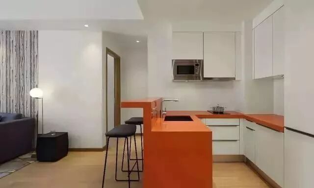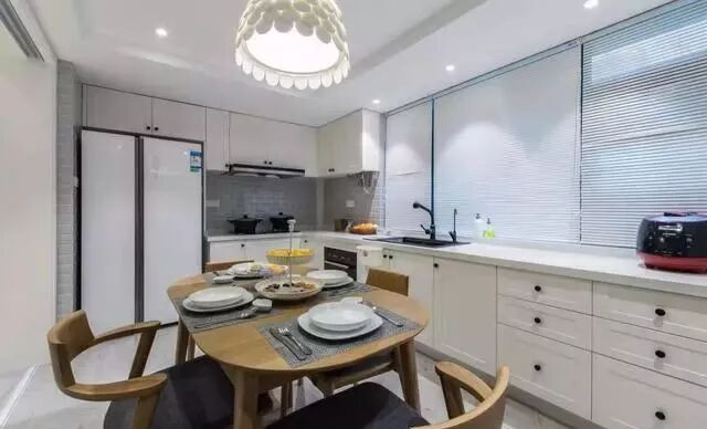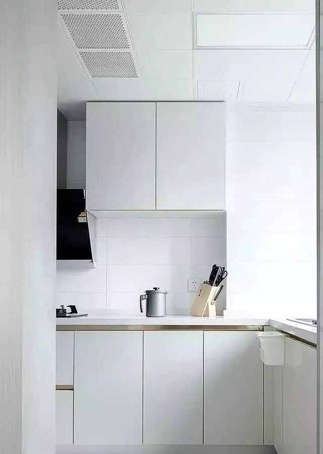 纯白色可能有点单调,可以用局部亮点来点缀:餐具、电器、花卉都可以做到,另外,选个深色的台面,效果也相当的好!