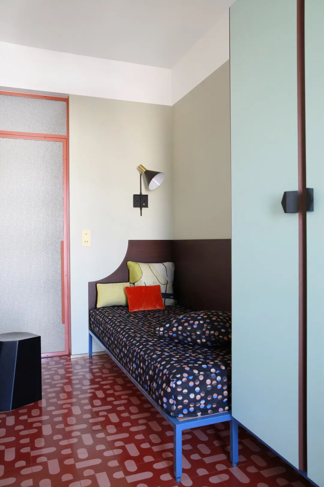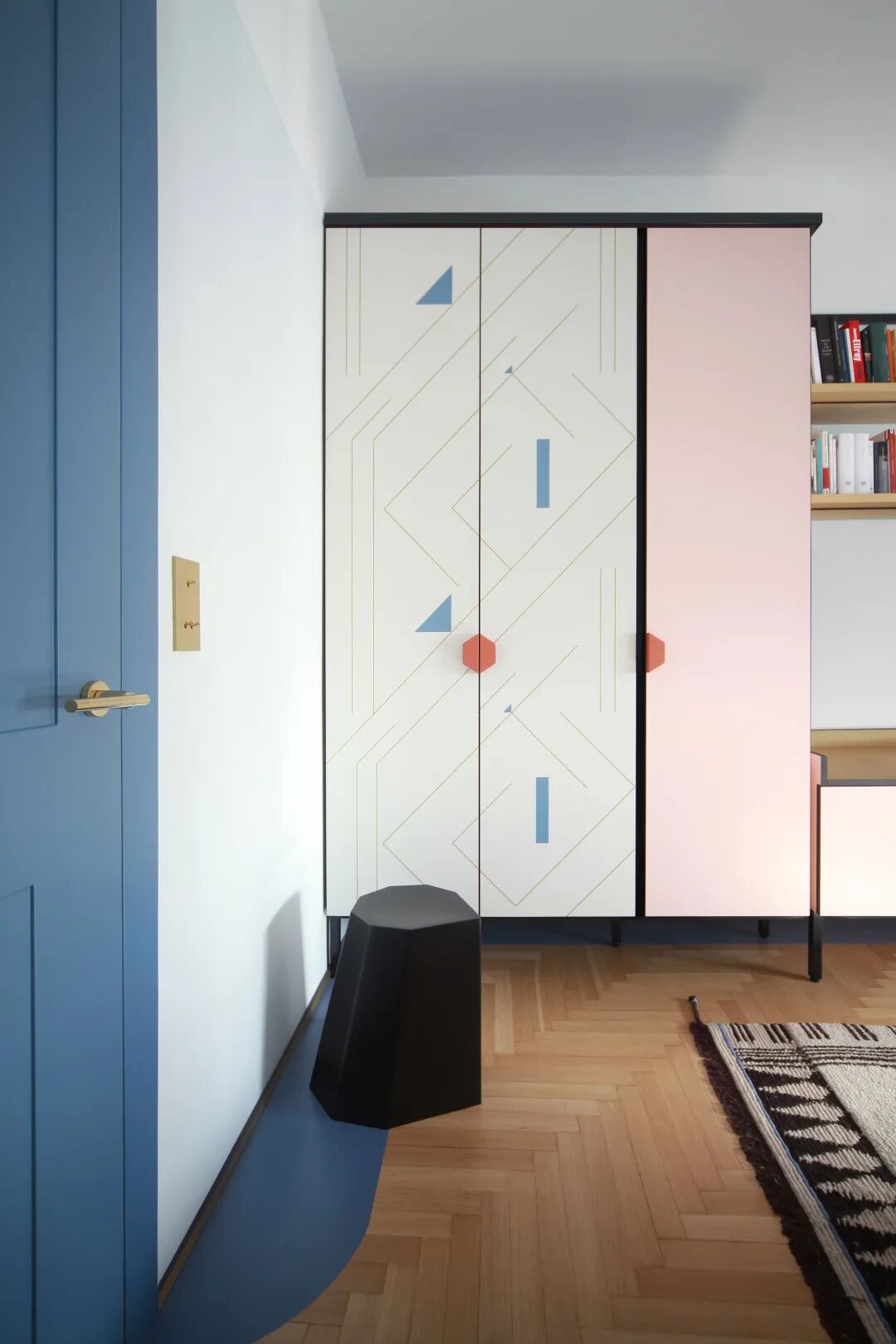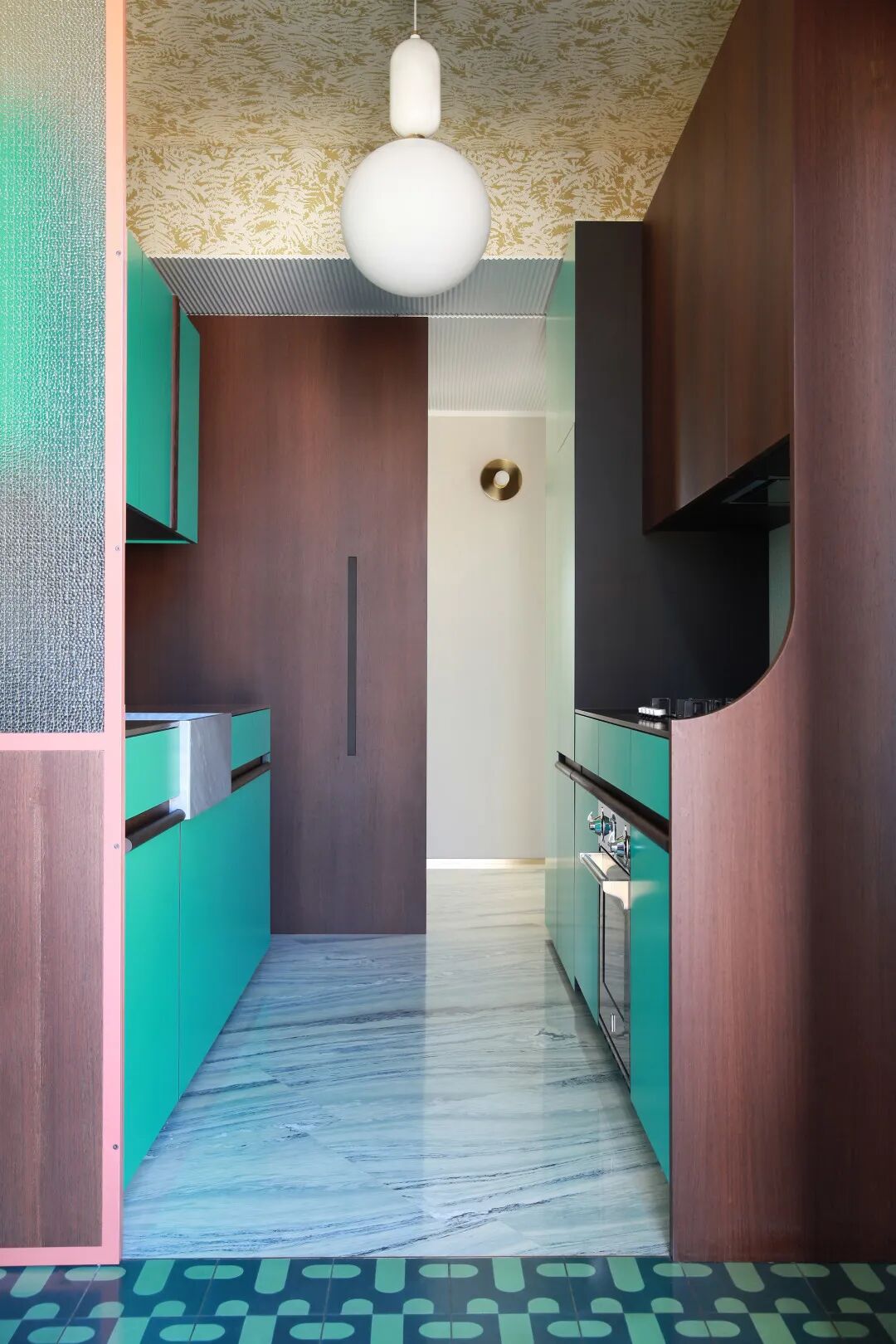 厨房延续了客厅的灰色大理石地面,使用了几何感强烈的绿色花砖,与橱柜的绿色呼应起来。