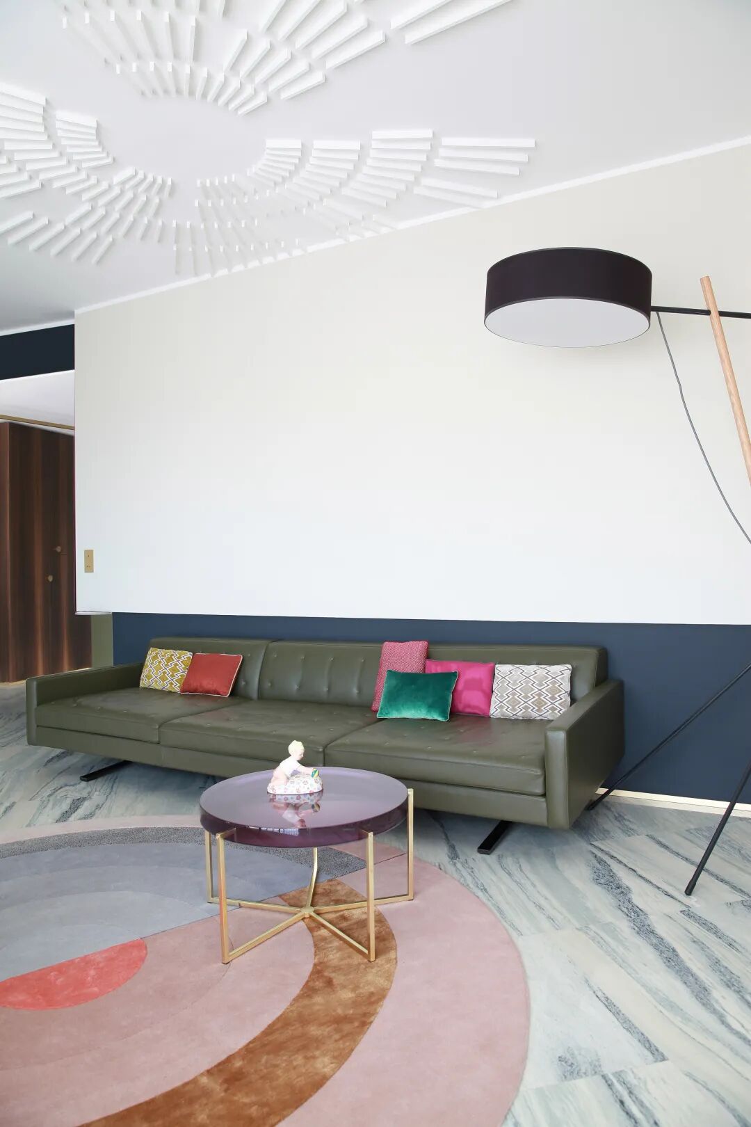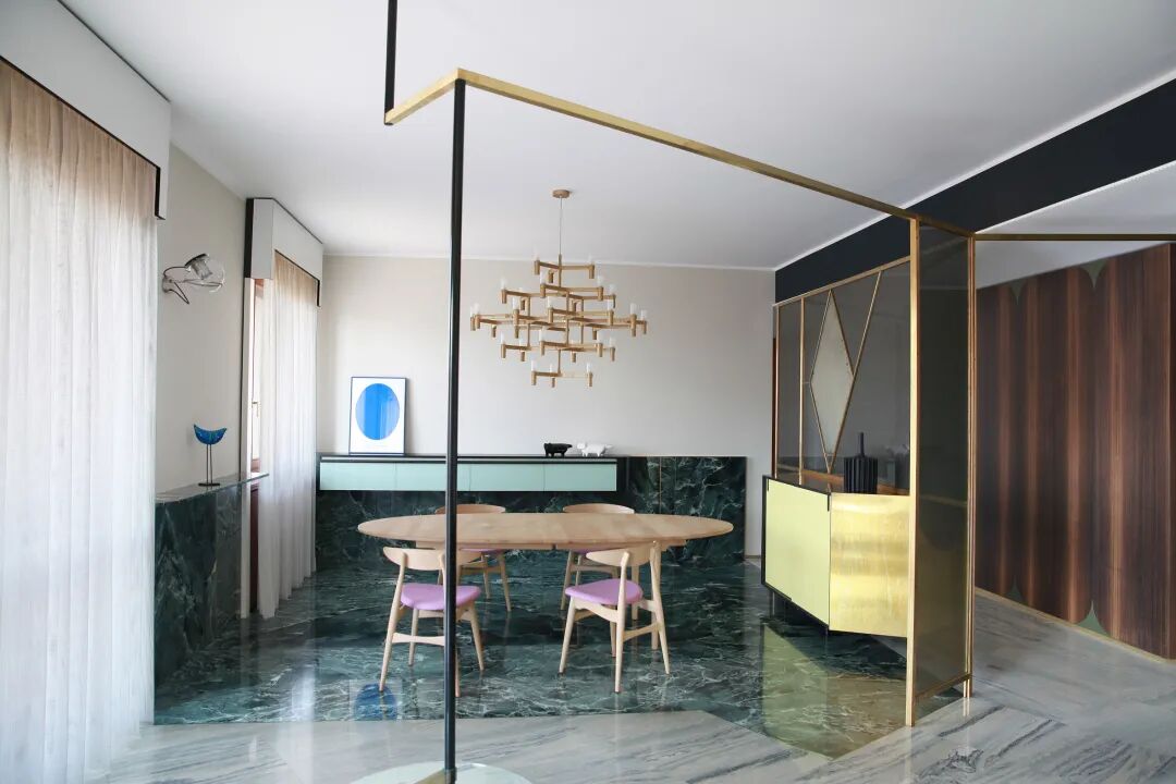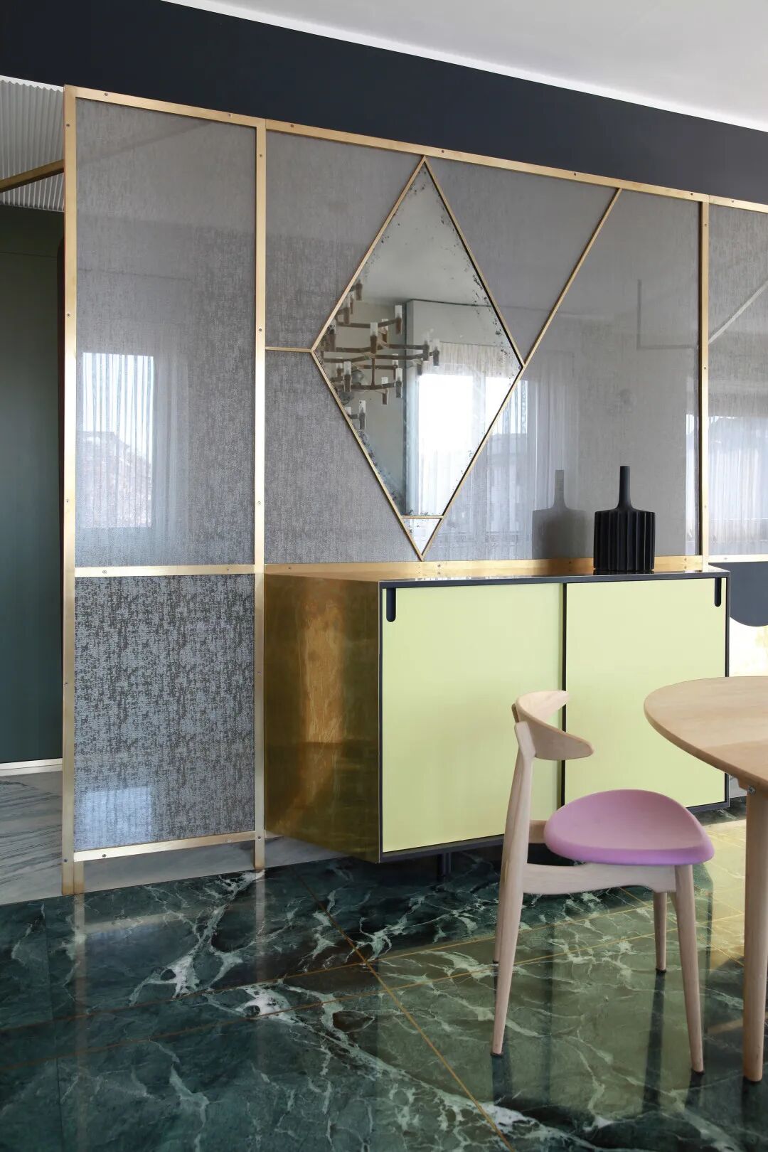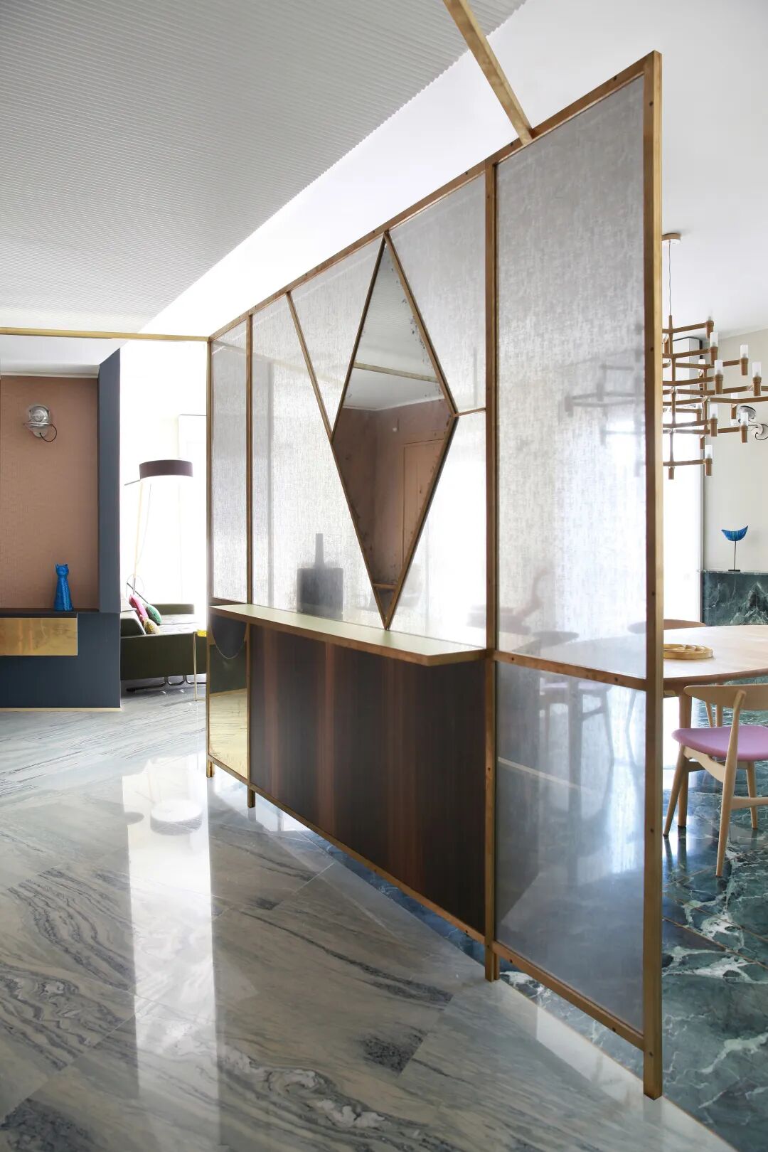 镶嵌着菱形镜子的屏风,贯穿在客厅和餐厅之间。