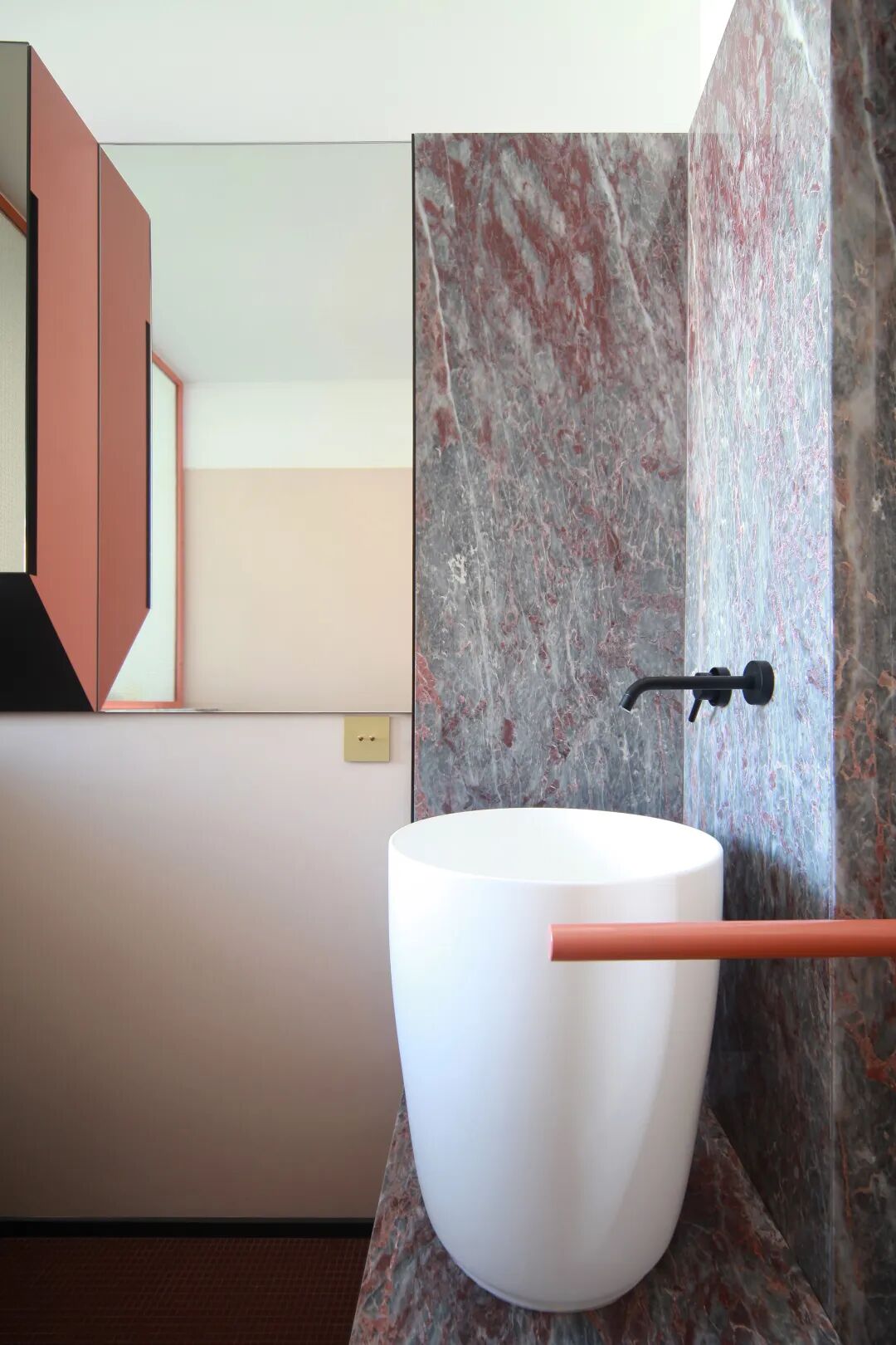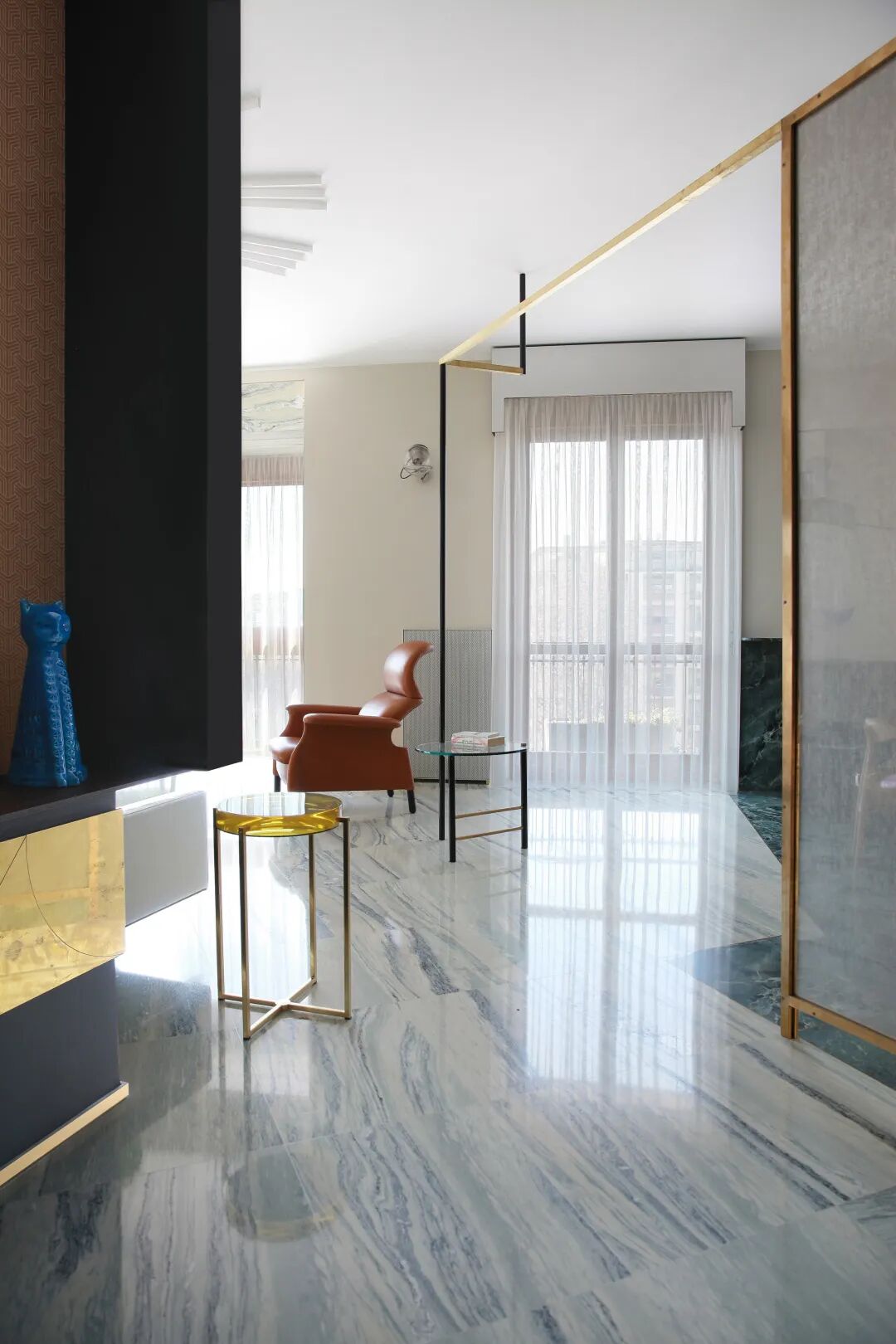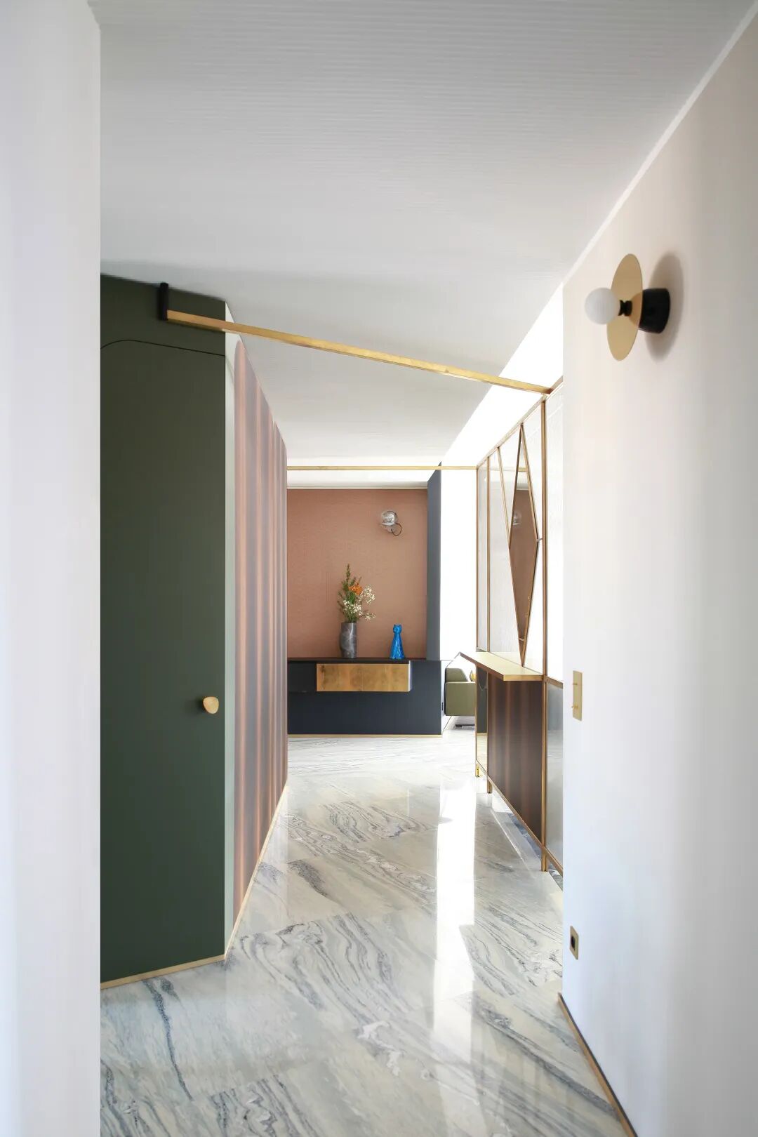 长长的中央走廊通向其他房间,这里同样运用了灰色大理石地面。