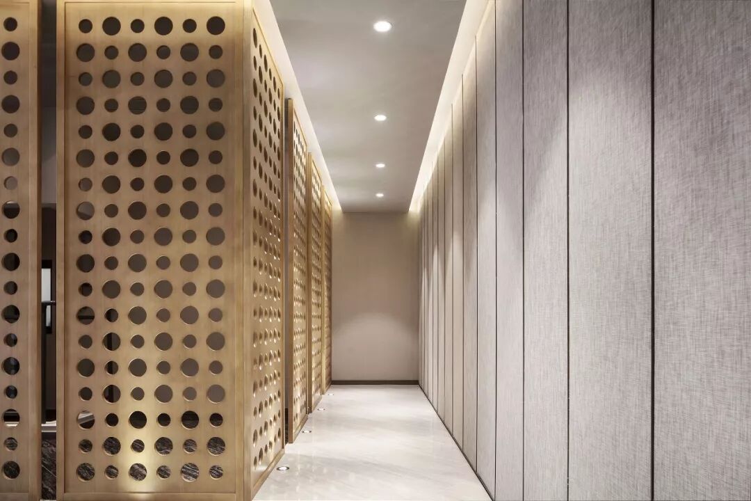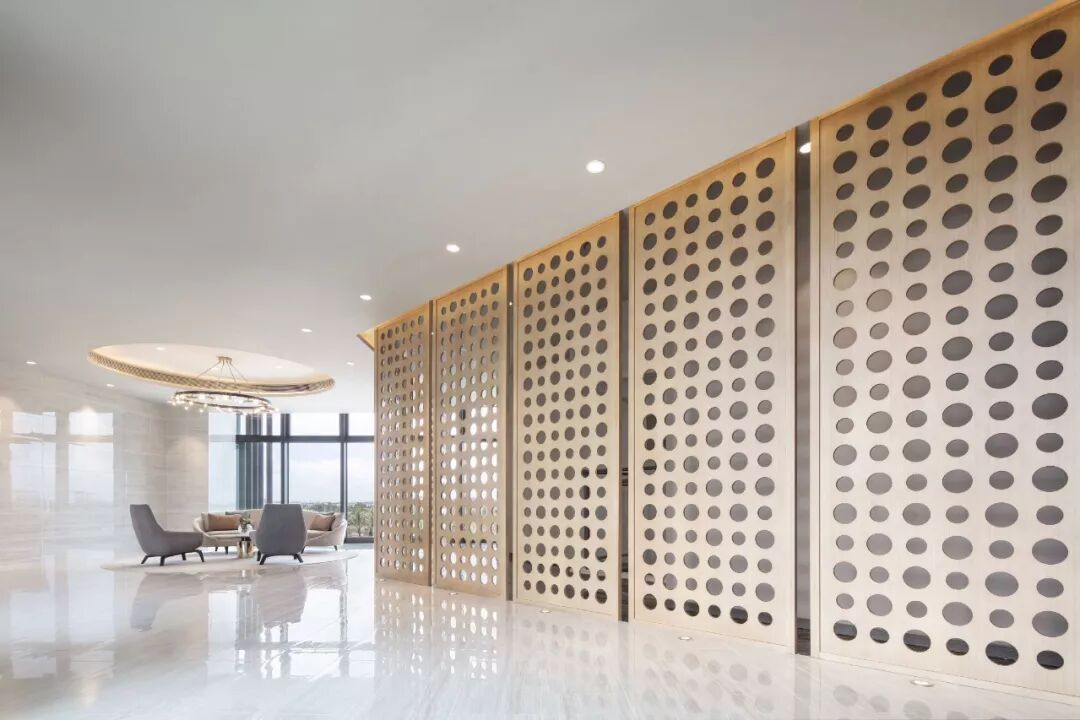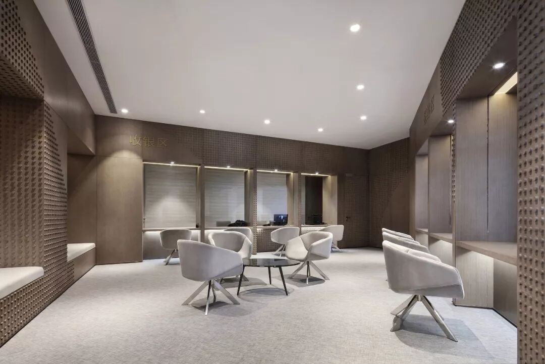圆型镂空屏风牵引步履,使人格外舒心,从签约空间延续至明亮的 VIP 室,深浅色泽、疏密纹理至拼贴心思,将意象堆迭使空间表达情绪。