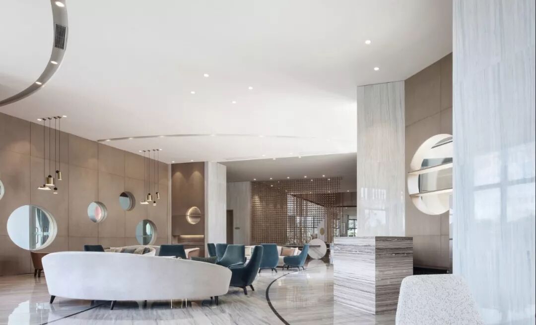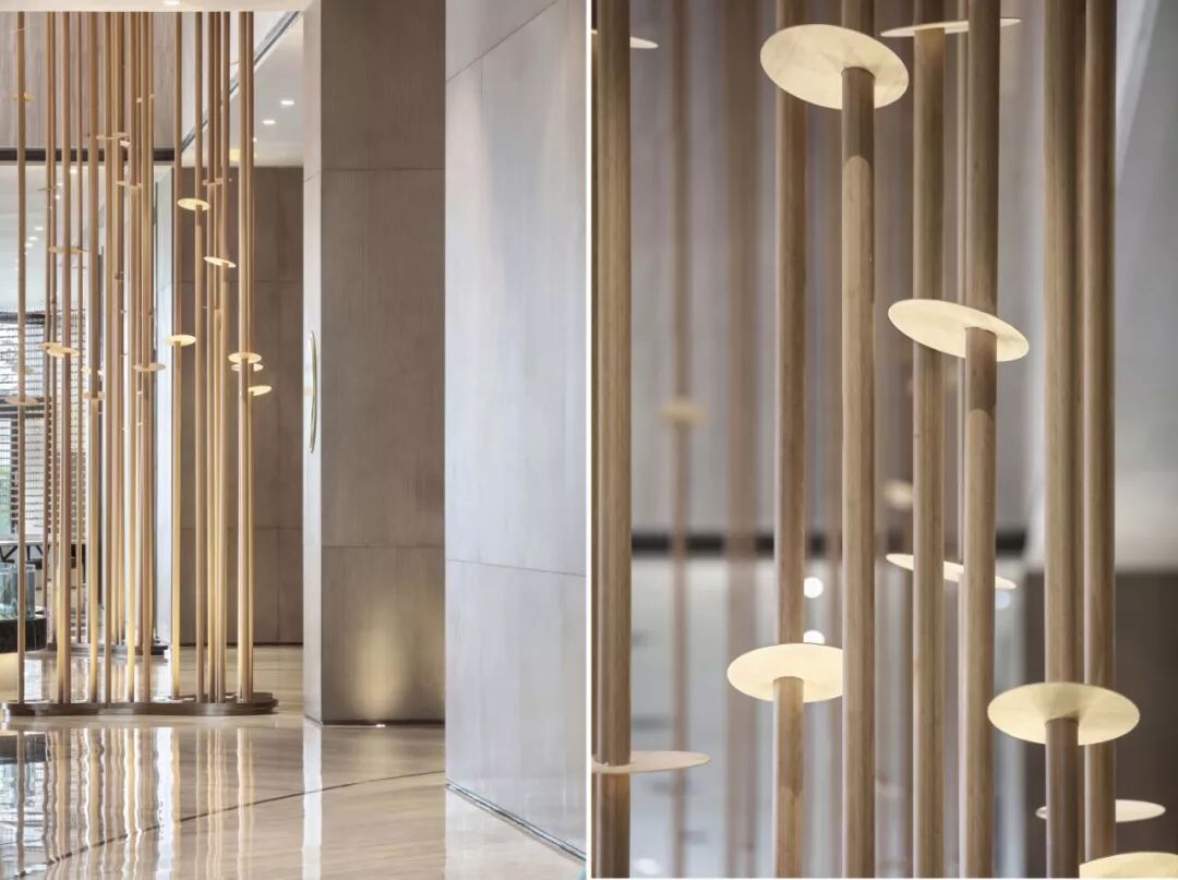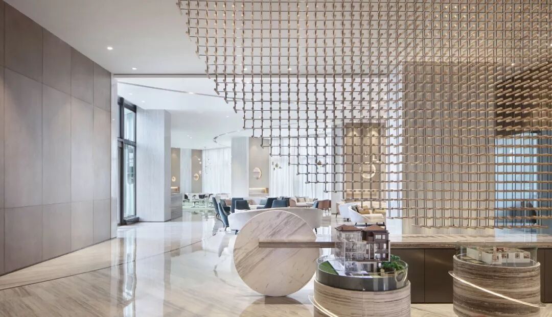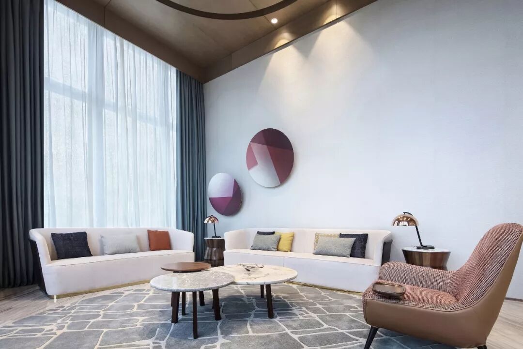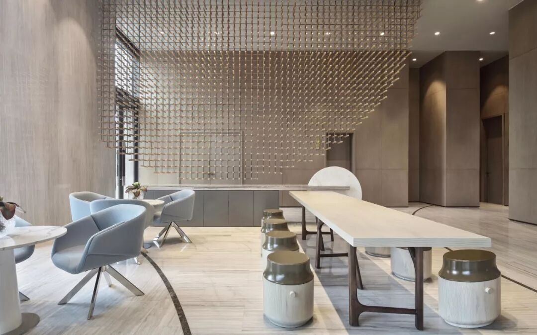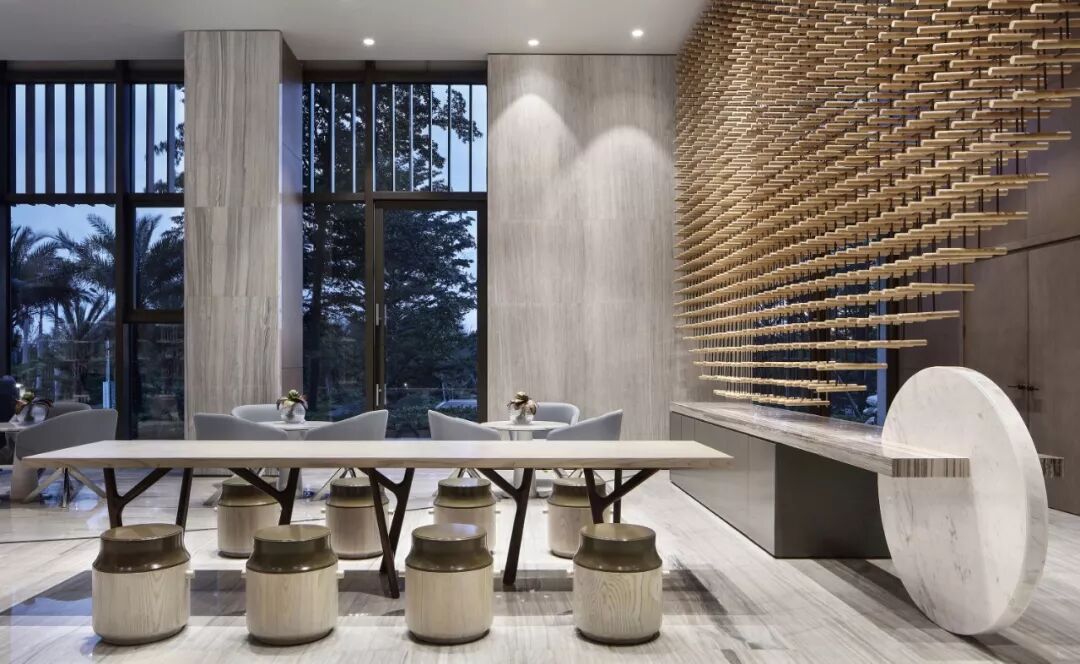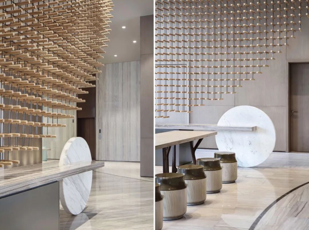 以最基本的元素 ─ 点、线、几何塑造视觉层次,褪去营销的氛围只为唤起对自然的渴求,接待处大理石几何对比强化视觉,温和的木材对比大理石细腻的奢华质韵平衡感受显得格外惬意,色泽与肌理渗透天然美感。