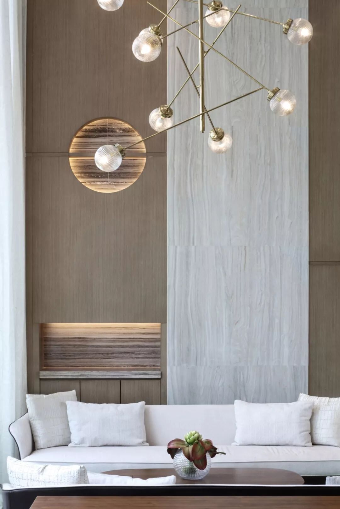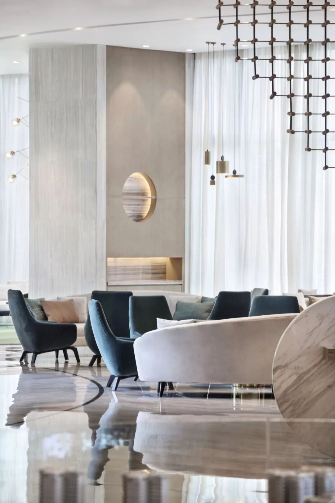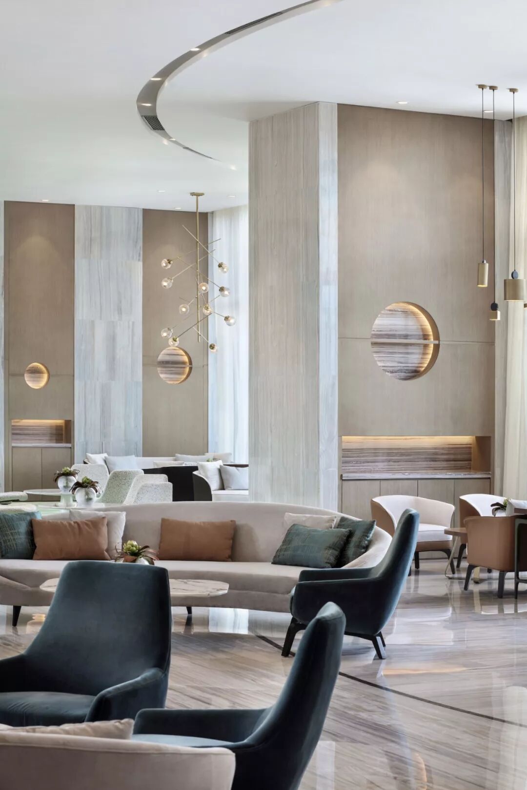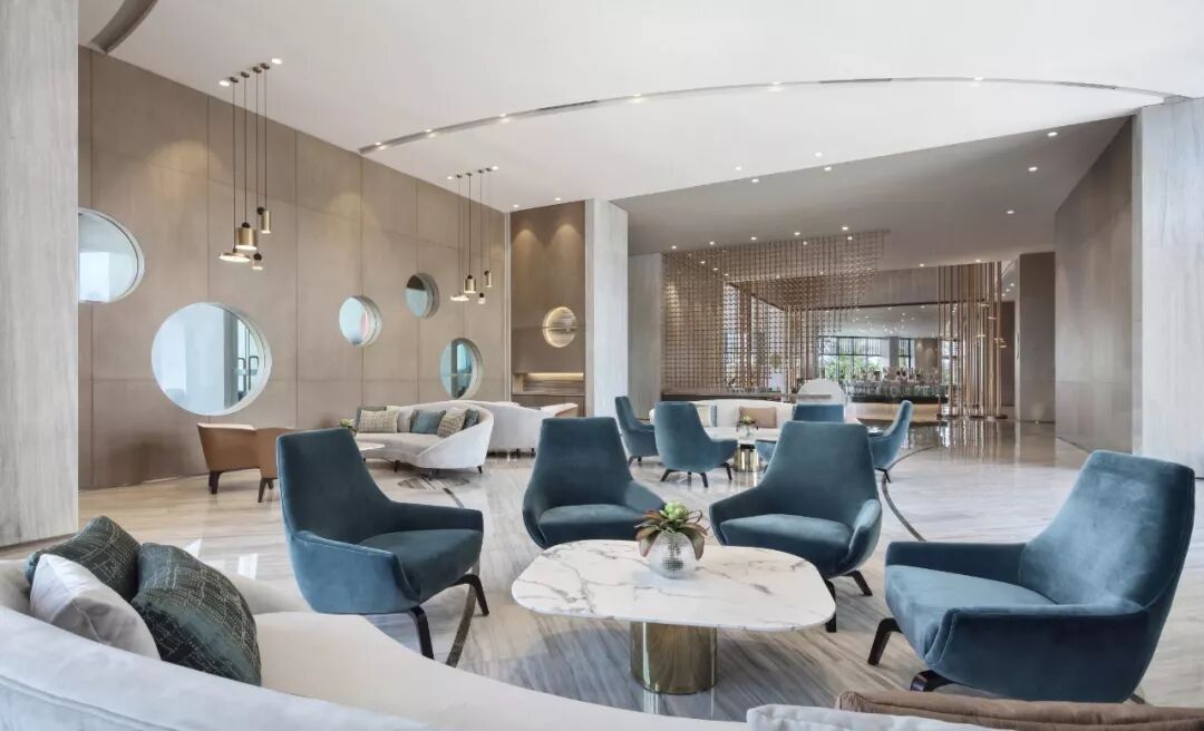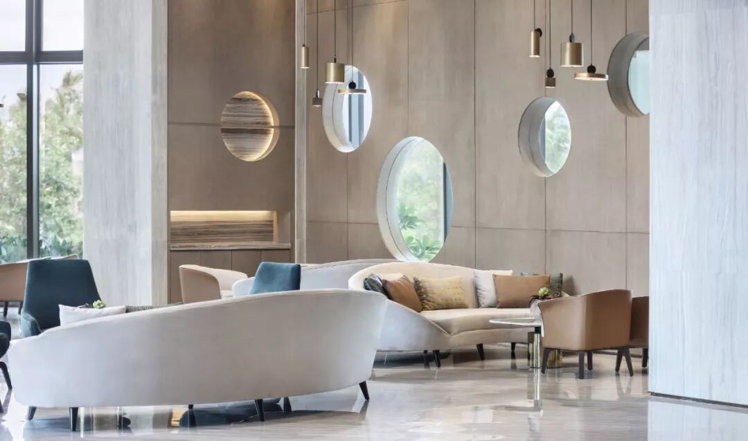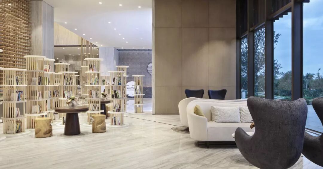 以最基本的元素 ─ 点、线、几何塑造视觉层次,褪去营销的氛围只为唤起对自然的渴求,接待处大理石几何对比强化视觉,温和的木材对比大理石细腻的奢华质韵平衡感受显得格外惬意,色泽与肌理渗透天然美感。