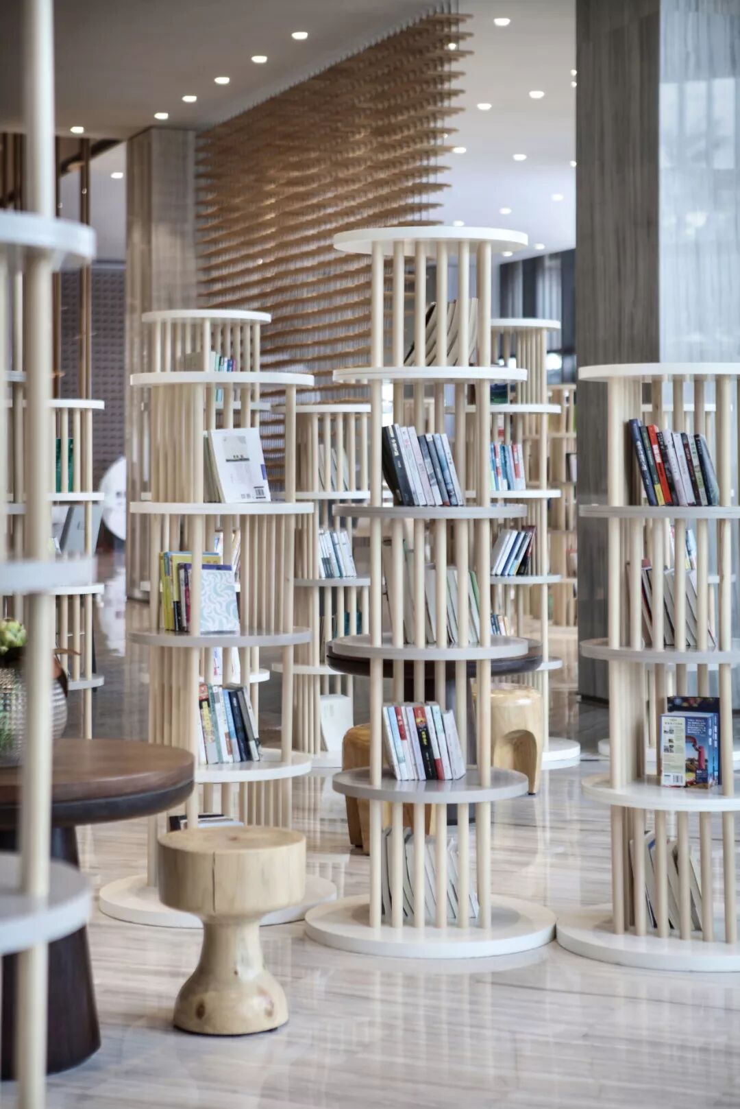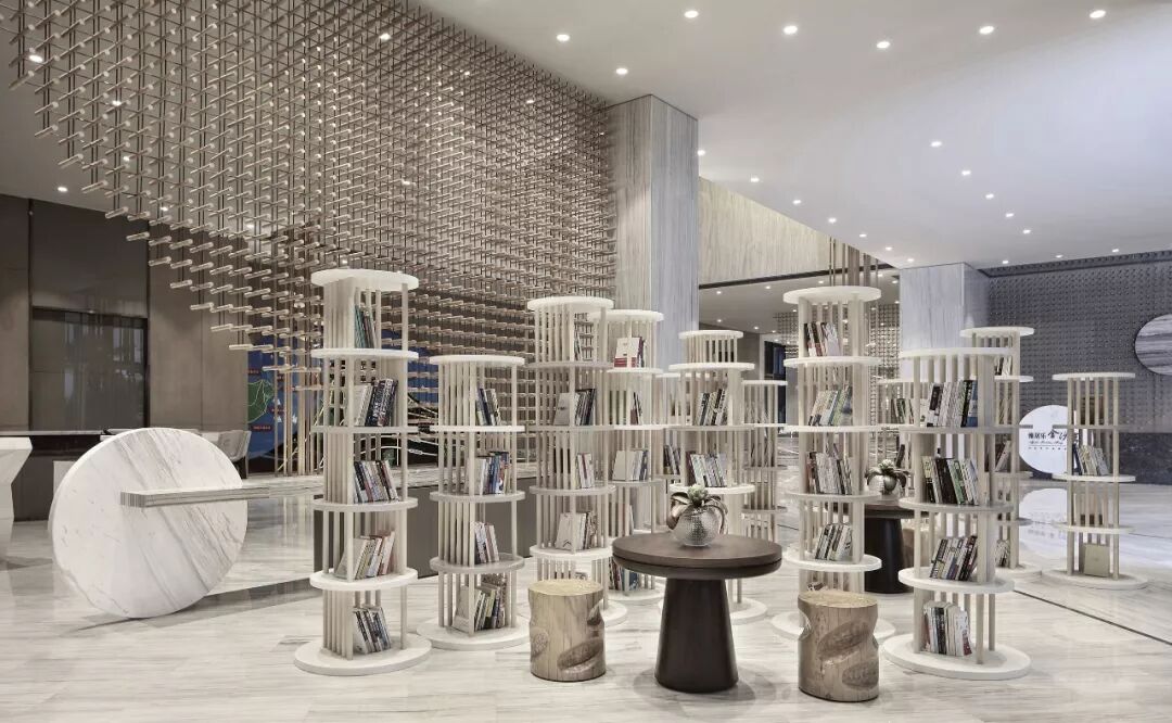 阅读区高低不一的书架透过圆柱拼凑而成,无视觉负担的低调色系形成经典耐看的文雅,让品味人士可享受简单沉静的时光。