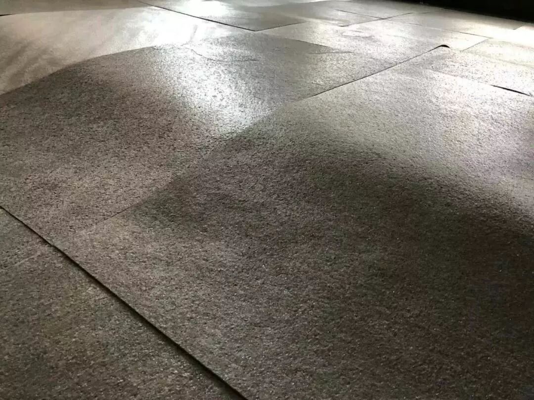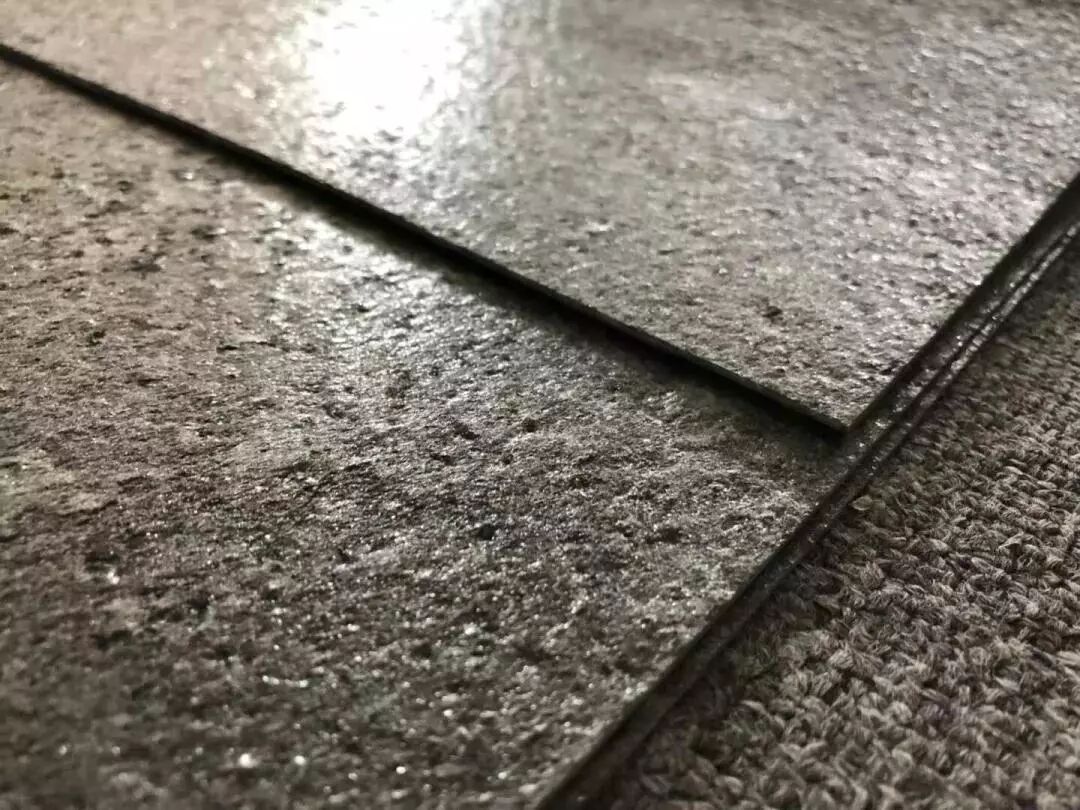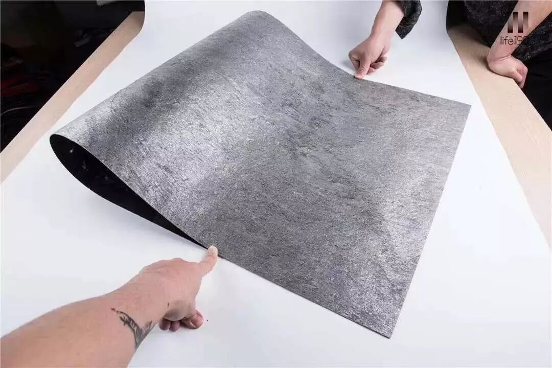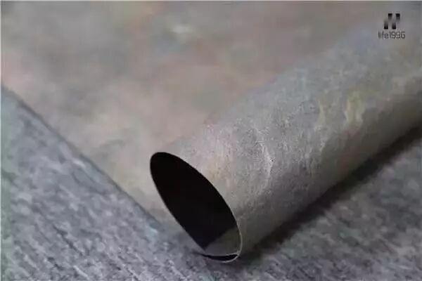 这轻盈如纸的材料是100%天然板岩面层,厚度仅有1~2mm,重量超轻,每平方米约1.5公斤,背面采用玻璃纤维加胶作底,使坚硬石材变得可以弯曲和变形。