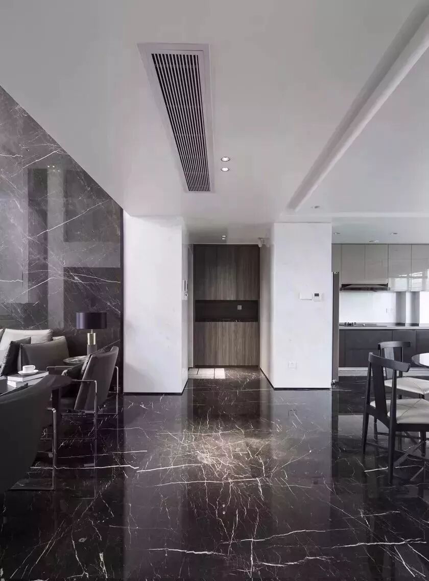 黑色是一个很强大的色彩,它可以庄重高雅,又能甘于幕后突显其他色彩;它能内敛沉默,又能简约利落。大理石的黑色主要以底色为黑带有条状或网状纹理。多用于门套,门槛和装饰波打线,地脚线。