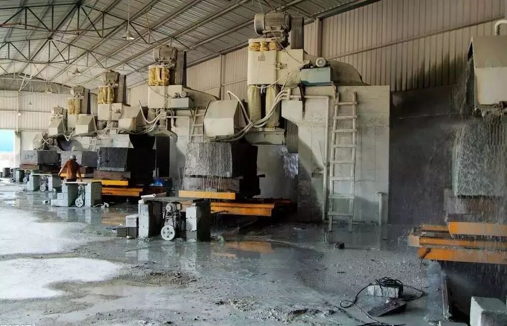2、锯割加工(荒料加工)。开采出来的大石块叫做荒料,一般是用金刚石圆盘锯进行锯解加工成石板,对于大理石,则还可以用金刚砂锯进行加工。金刚石圆盘锯使用一个大的圆盘形锯片,锯片上镶嵌有粉末冶金粘接的金刚石颗粒。这种设备可以加工超硬质石材,使用也比较灵活,缺点是圆盘的直径需要二倍的石材高度加上法兰盘直径,而太大的锯片直径制造不易,因此不利于加工超大规格板材。金刚砂锯是使用一排(多条)条状锯片,每条锯片类似于木匠使用的手工锯锯条,但金刚砂锯是多条平行排列,每条之间间隔与板材厚度相等,这样砂锯可以将整块荒料一次性锯解成很多片板材。但是金刚砂锯由于使用金刚砂作磨料,不太适合加工硬质的花岗岩,一般只用于加工大理石。另外,如果荒料中有缺陷,在加工前没有被发现的话,由于金刚砂锯加工是一次性完成,等到加工完发现缺陷就来不及了,将导致整块荒料报废,所花的加工费也浪费了,因此不适合缺陷较多的石材品种。锯割加工中主要的加工设备是花岗石专用的框架式大型自动加砂锯、多刀片双向切机、多刀片电脑控制花岗石切机和花岗石圆盘锯石机等。经过锯割的板材称为毛板。