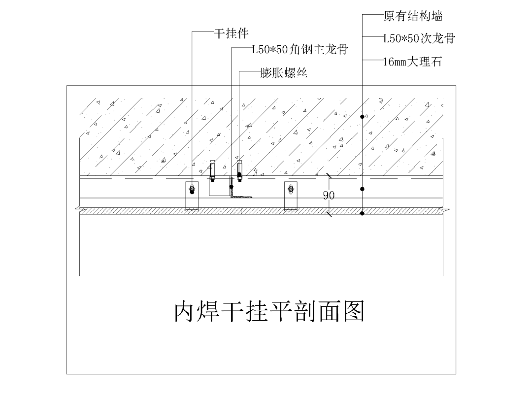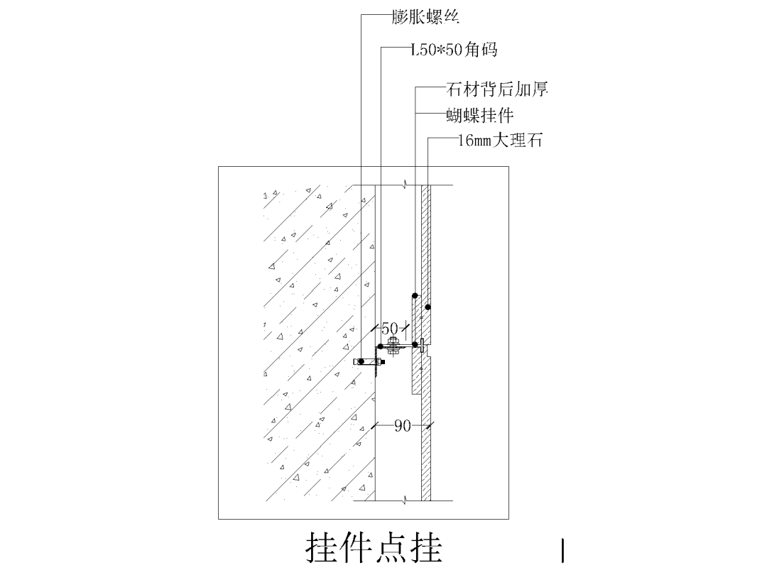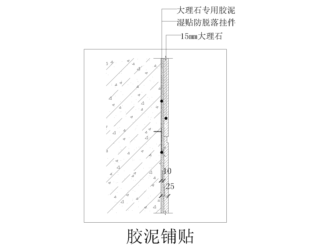 ◆完成面,下图为墙面胶泥铺贴,水泥基底到石材完成面>25mm;适合卫生间墙面和厨房墙面两个空间部位,因潮湿最好不用干挂及点挂结构。