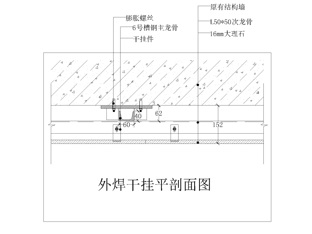 ◆辅材,1.不锈钢膨胀螺丝,2.不锈钢干挂飘件,3.云石胶,4.干挂AB胶,6#槽钢主龙骨及∠50角钢次龙骨;