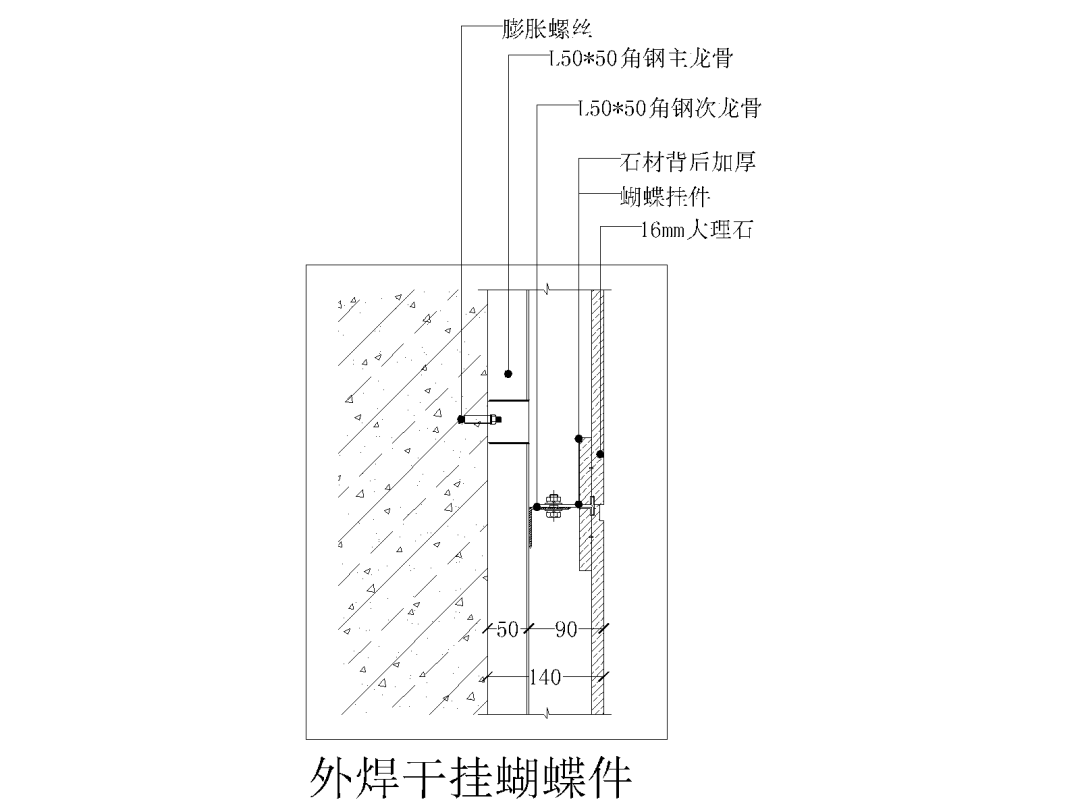 说明:水平缝位置为拉槽处理工艺,如果采用蝴蝶挂件,板底背面需要粘接花岗岩石材增加厚度,利于挂件的开槽机安装。