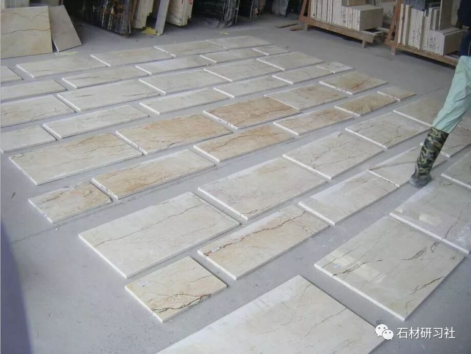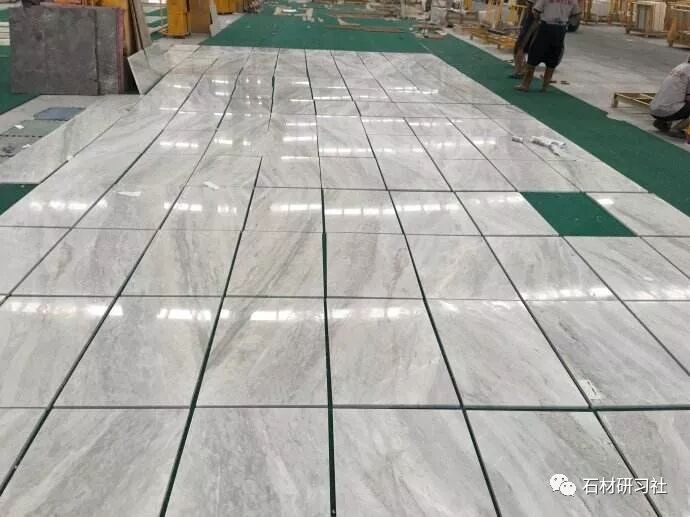 虽然上道工序已排版,但天然石材同一矿区因位置不同,颜色也有差异,而且同一块板面都会出现阴阳色,花纹、颗粒也存在分布不均匀。此外,石材内部也存在扫花、黑斑、杂质等因素,故需进行第二次排版。