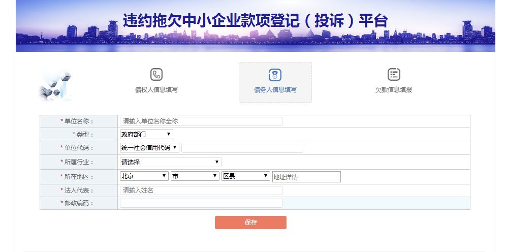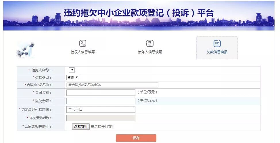 3、信息登记:包括债权人信息、债务人信息、拖欠款项信息。