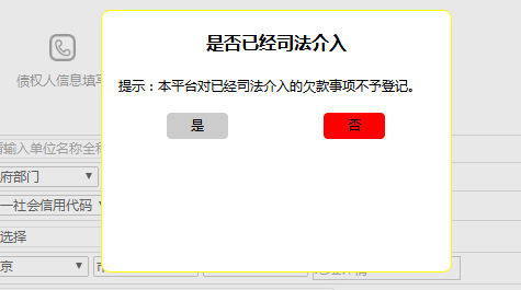 编者注:在填写“欠款信息填报”时,会出现“是否司法介入”弹窗,点击“否”即可进入!
