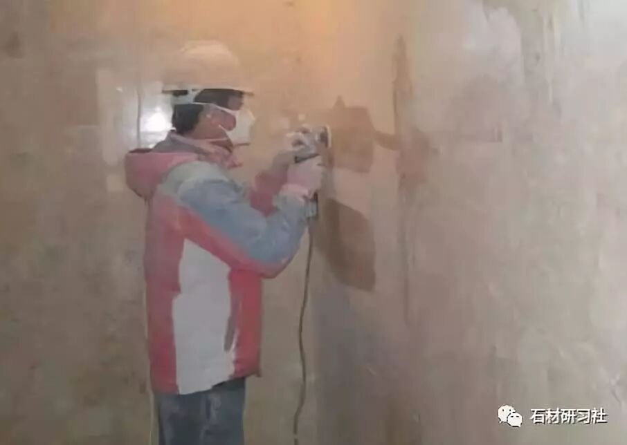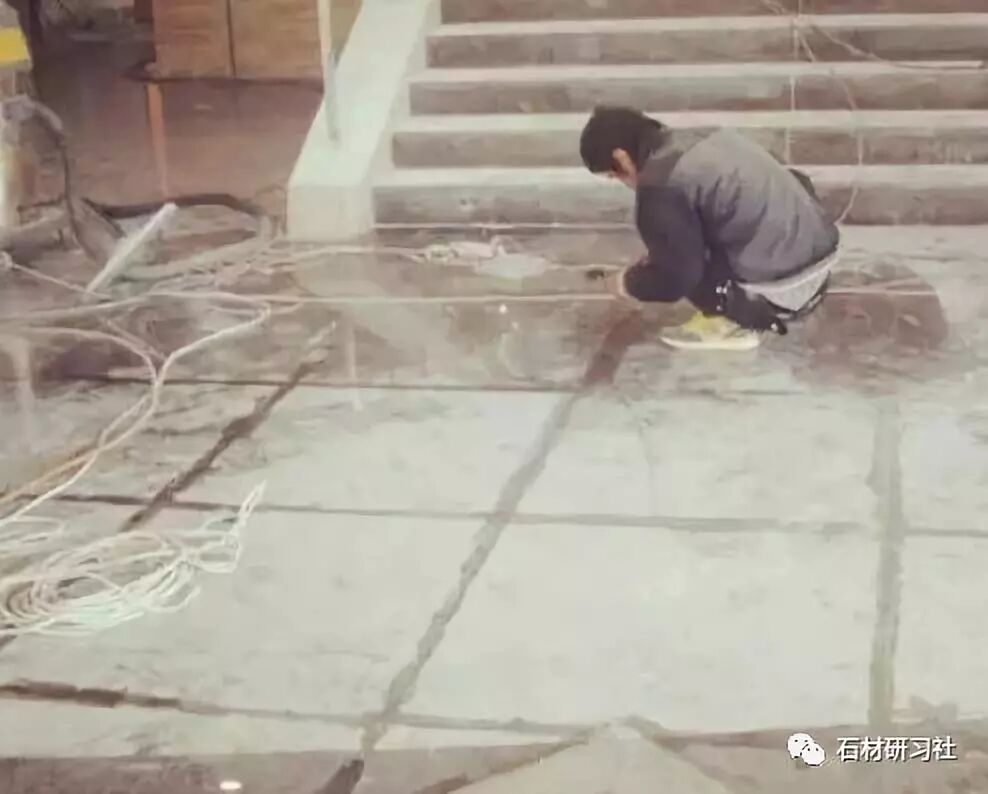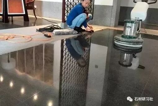 1、用50目干磨,先把地面打磨平整,把石材表面的毛细孔打开;