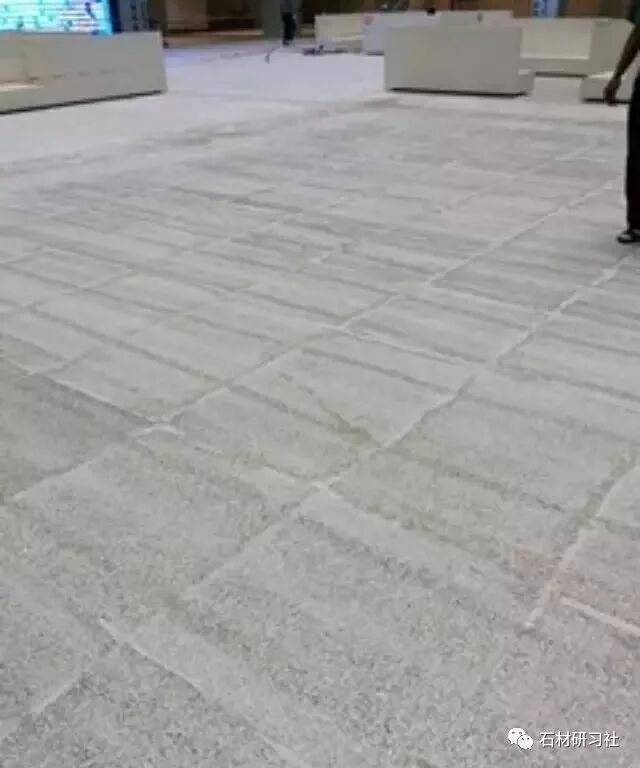 现场的石材经过施工和踩踏,石材表面的毛孔是堵塞的,可能也存在一些污染,这时直接涂刷防护它的渗透力是有限的,而我们下面工序就是剪口磨平,磨削的深度在3MM左右,防护层很容易被破坏,所以说这种直接涂刷防护的做法无法根本解决问题。