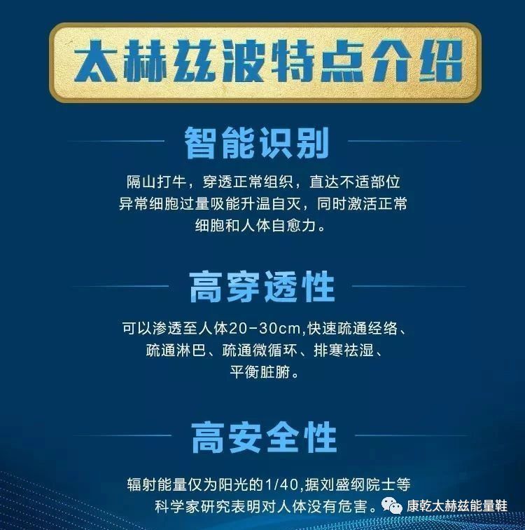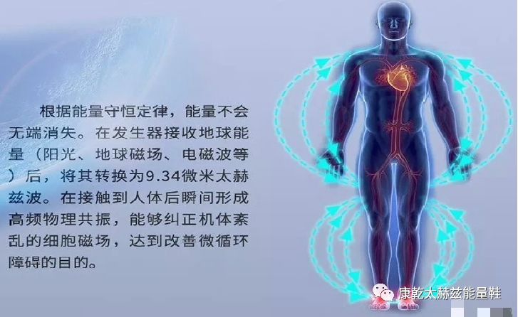 太赫兹健康鞋工作原理,在鞋子的涌泉穴处内置一枚太赫兹能量波发生器--太赫兹芯片,可以通过吸收、转换、发射三个步骤,将电磁波、南北磁场、阳光等能量进行吸收,并转换为9.34微米太赫兹波,在接触到人体后瞬间形成高频物理共振,能够纠正机体紊乱的细胞磁场,从而激活细胞,通畅经络,使得身体所有细胞有充足的氧气、养份供应提高人体自身免疫力。达到改善人体微循环障碍的目的,起到缓解疼痛,消除肿胀,改善肢体障碍的效果。