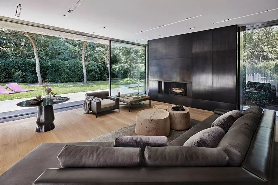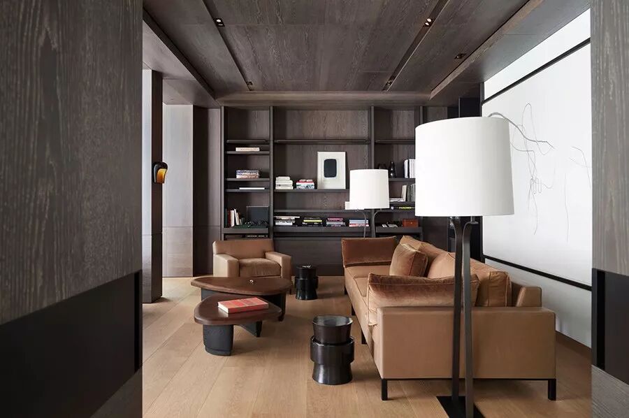 起居室以黑色橡木为墙面主材,显得稳重大气。浅褐色 Bouddha 扶手沙发,面料采用 Liaigre 天鹅绒拼皮,与浅色木地板融为一体,温馨典雅。▽
