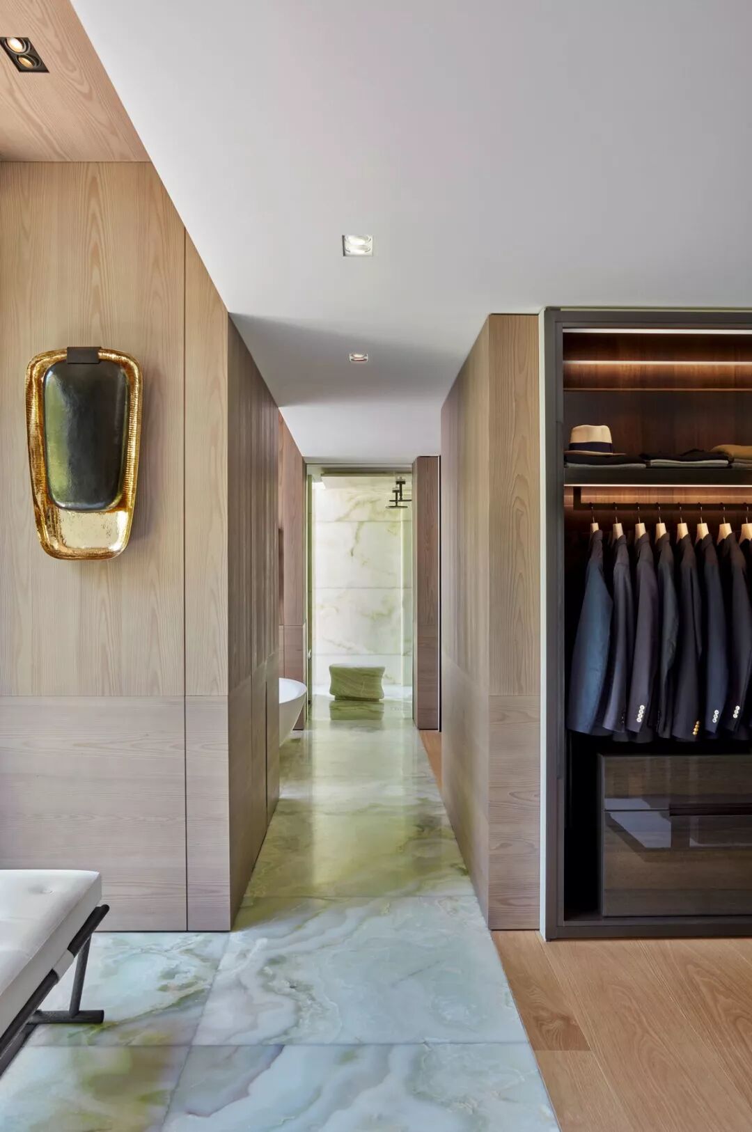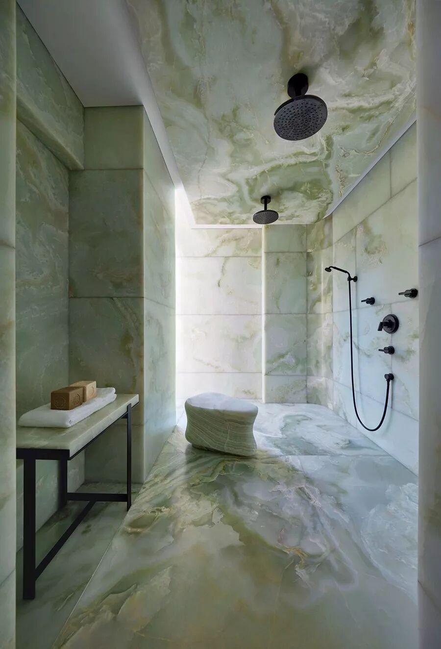整间浴室全部使用绿玛瑙做饰面和吊顶,开放式的设计,将绿玉石地面一直延伸到步入式衣帽间,石材的天然花纹和雪松木的温润质感形成对比 ▽