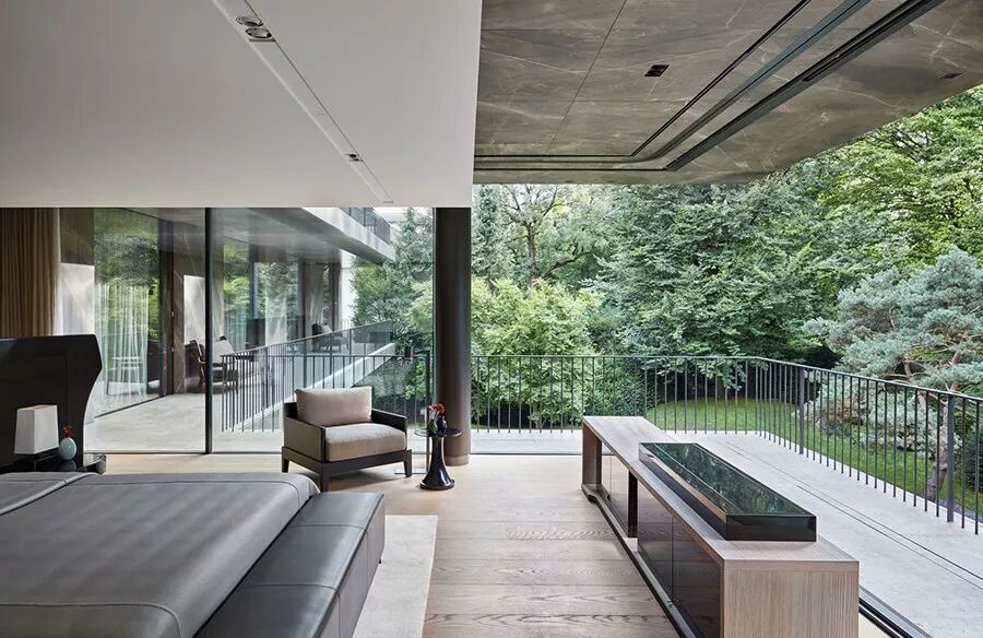 打开滑动玻璃门,整间卧室便于室外相连,仿佛睡在树林中一般 ▽