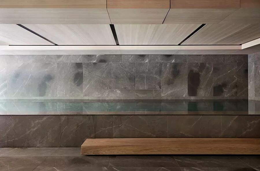 走廊以浅木和灰黑为主要色调,加入了木饰面拼接出深浅不一的曲线墙面,天然石材与落地玻璃墙的黑色钢制框架相互融合 ▽
