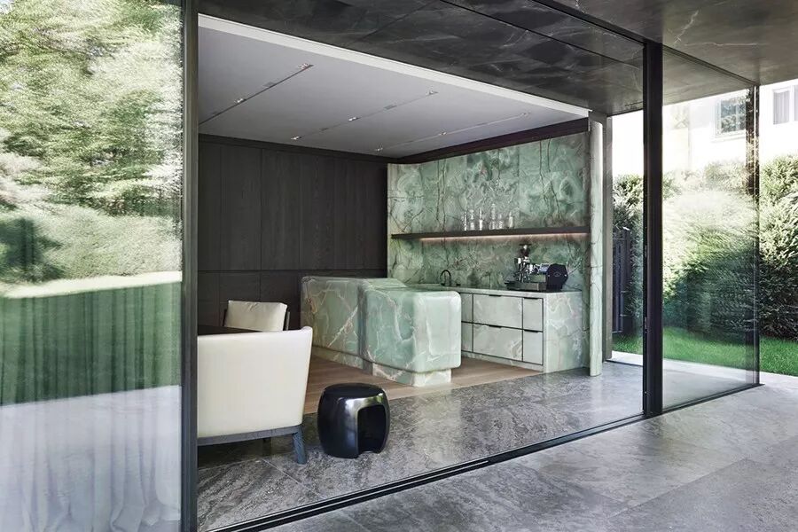 咖啡吧配有整套 Hestia and Mandarin 休闲椅 ,翠绿色加利福尼亚缟玉石拼成的吧台和墙面简直贵气逼人 ▽