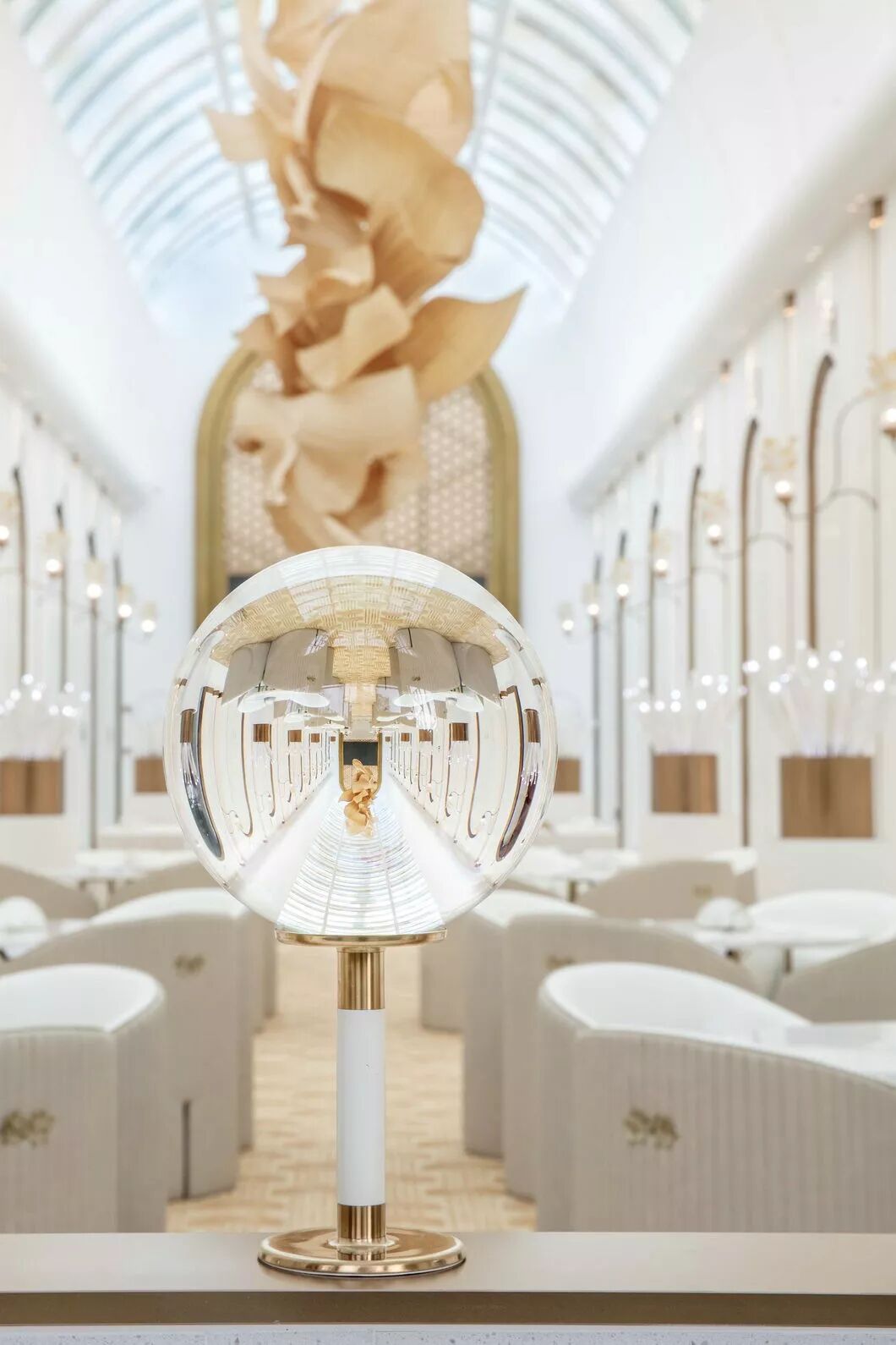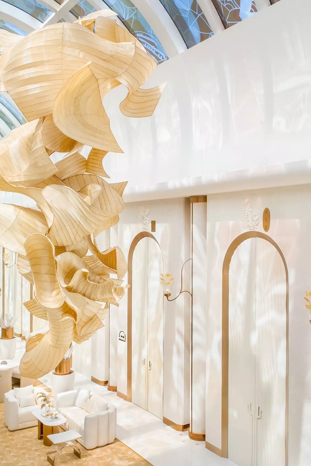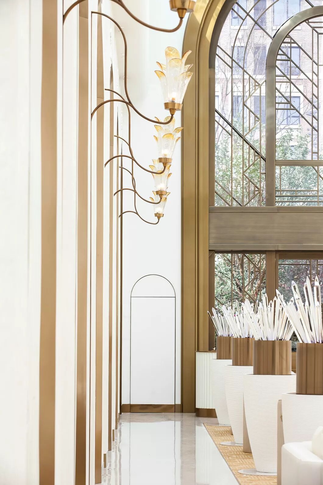 中庭阵列的水晶壁灯,是以上海市花白玉兰为元素演变而成。