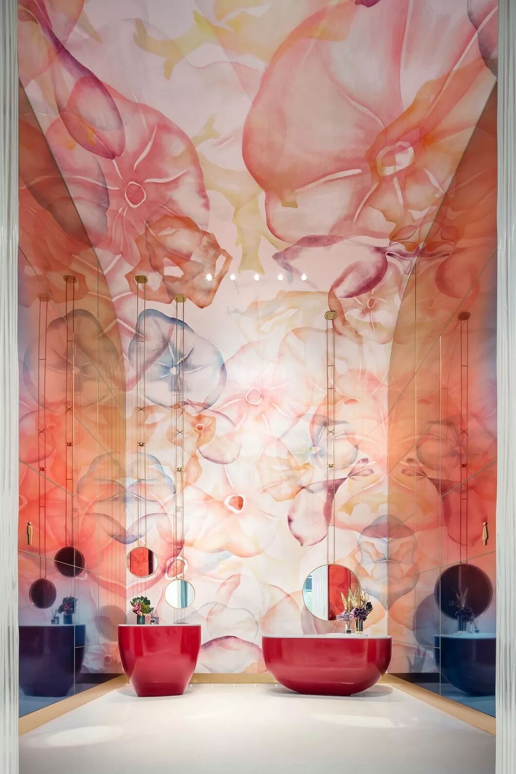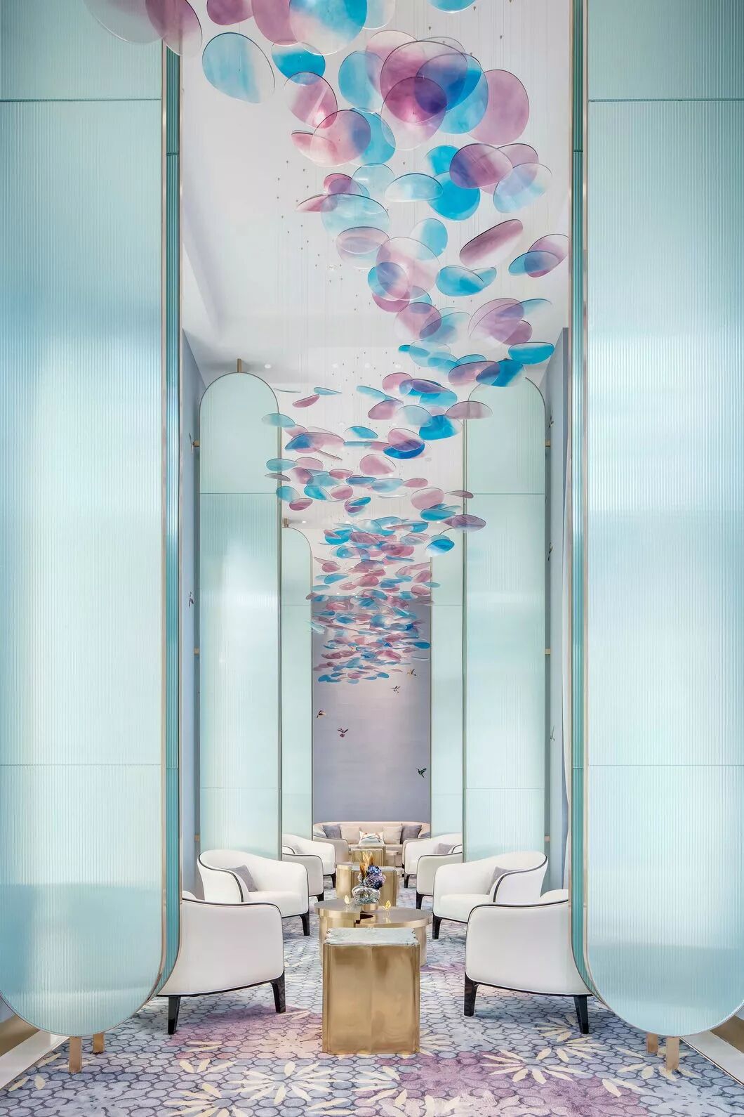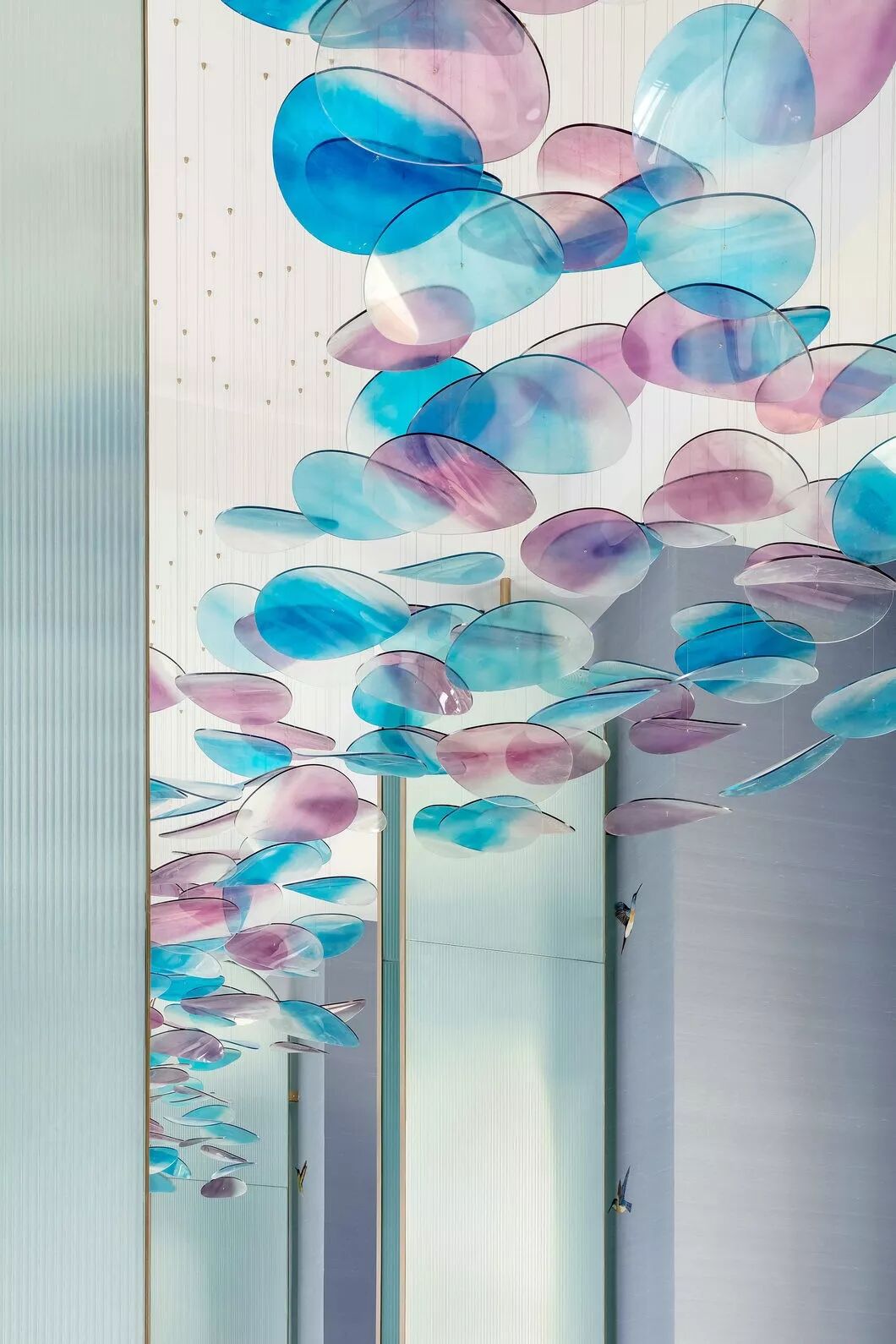 墙面的艺术镜面玻璃,使原本瘦高的空间无限拉伸,也赋予了中间花朵更多的色彩变幻。
