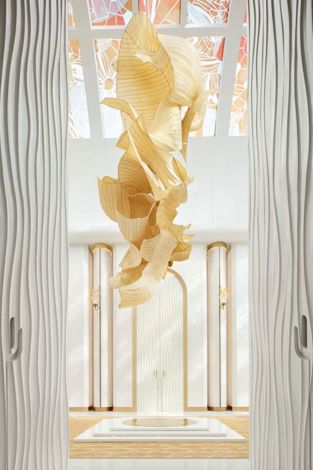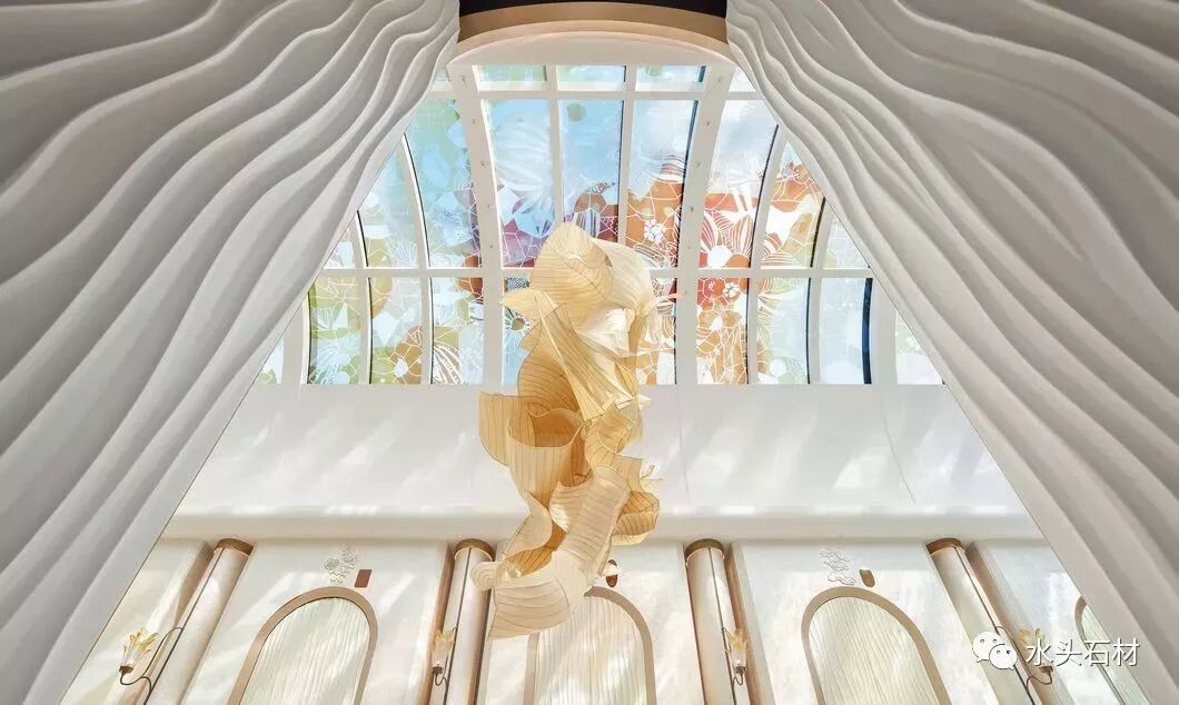 中庭大型装置位于整个空间的中轴对称点,以流畅的曲线为造型,通体6米高,以一种特殊的天丝材质制作,从手工弯曲骨架焊接,再贴制丝绸,整个过程历时半年之久。