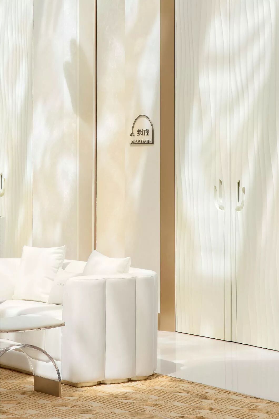 同样阵列的水晶雕塑,灵感来源于香奈儿那场震惊世界的长城大秀,当夜幕降临透过菱形水晶柱折射出的光线让整个洽谈区恰似一个时尚的秀场,魔都作为一个全球开放的城市,时尚和经典在这里碰撞交融。